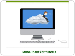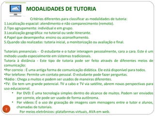 O documento discute diferentes modalidades de tutoria e ambientes virtuais de aprendizagem. Ele descreve modalidades como presencial, à distância, individual, em grupo e de acordo com o papel do tutor. Também discute o uso de tecnologias como meios eletrônicos e plataformas virtuais para tutoria remota e como os ambientes virtuais de aprendizagem facilitam a interação entre estudantes e tutores.