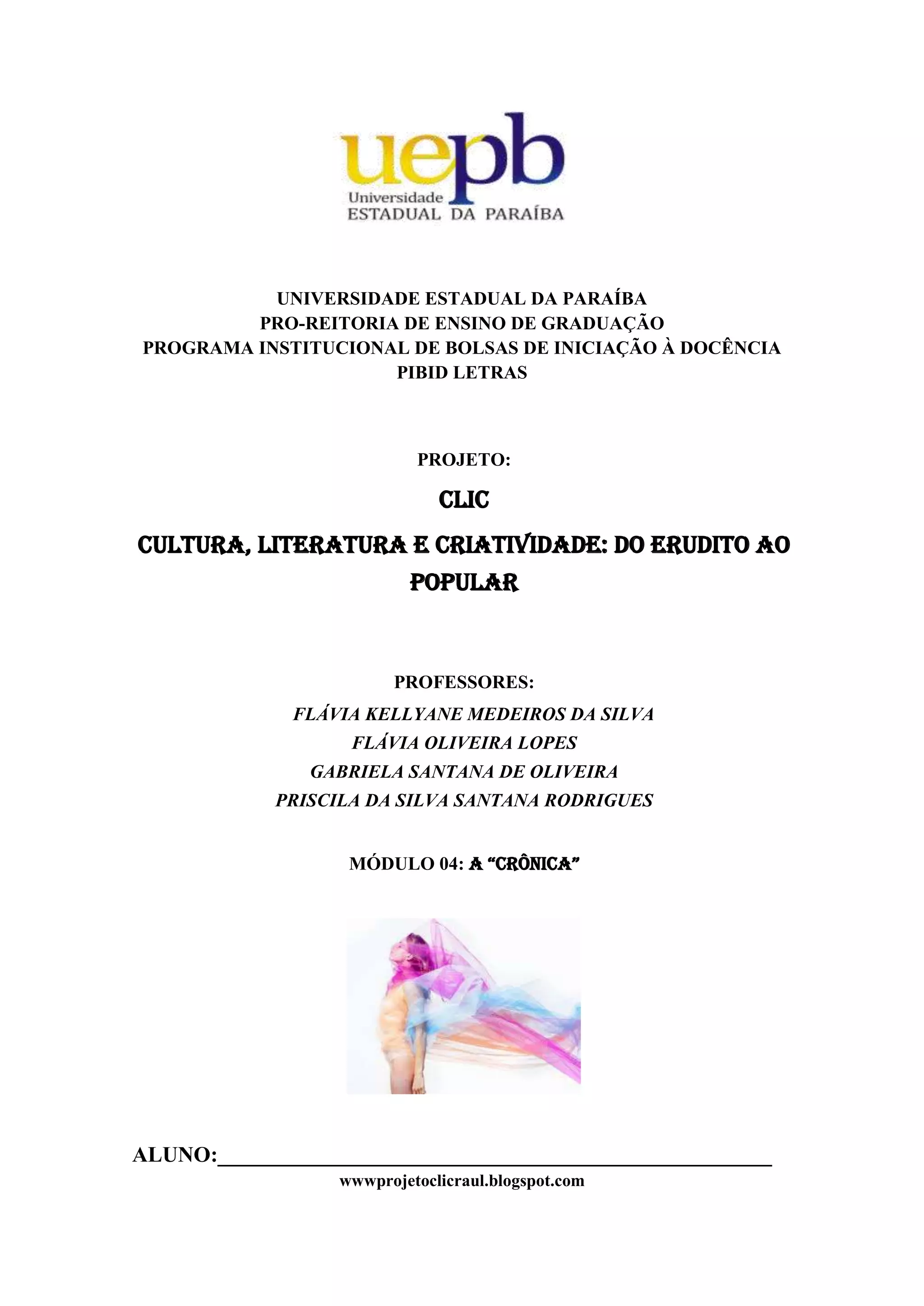 O documento descreve um projeto do Programa Institucional de Bolsas de Iniciação à Docência (PIBID) da Universidade Estadual da Paraíba sobre cultura, literatura e criatividade. O módulo 04 trata da "Crônica" e apresenta a crônica "Mãesinha", discutindo as dificuldades de ser mãe e os medos da infância de não ser aceita.