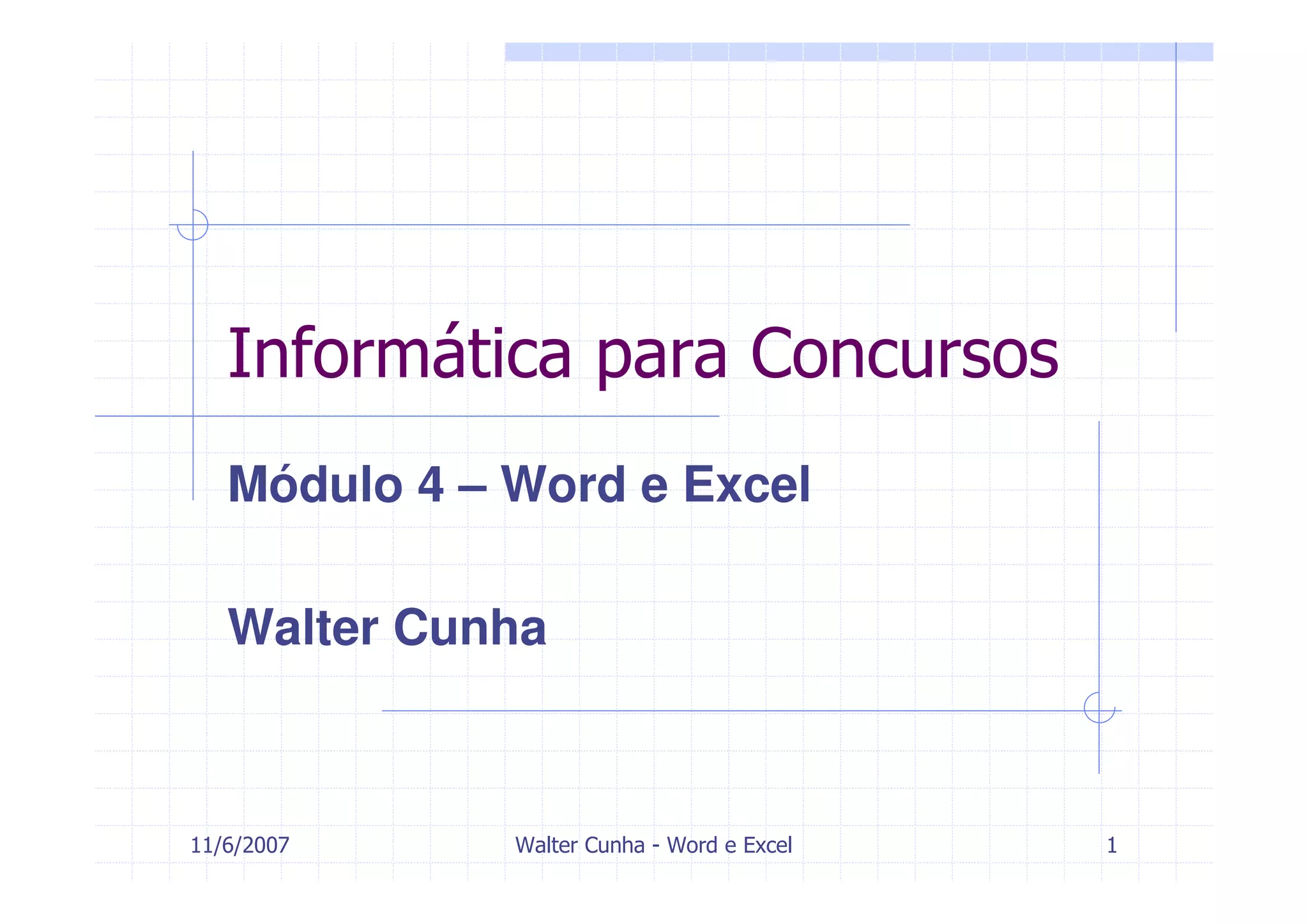 Este documento apresenta um módulo de treinamento sobre o Microsoft Word e Excel ministrado por Walter Cunha. O módulo inclui instruções sobre funções básicas e avançadas de Word e Excel, como formatar textos, criar tabelas, usar marcadores, imprimir documentos em Word e usar fórmulas, funções e gráficos em Excel. O documento também contém exercícios com respostas sobre os tópicos ensinados.