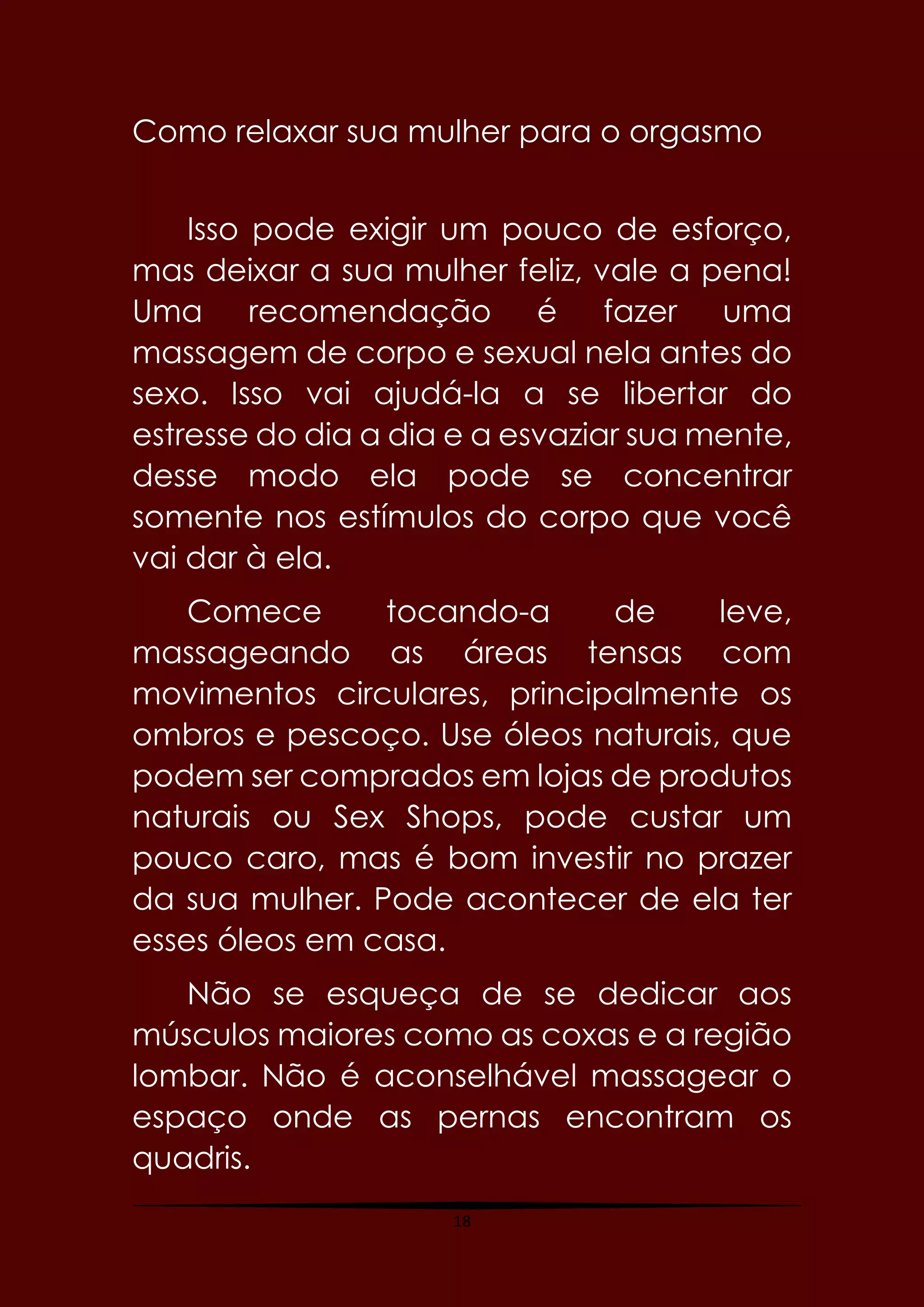 O documento fornece instruções sobre como dar uma massagem íntima relaxante para uma mulher, com o objetivo de levá-la ao orgasmo. Ele recomenda começar com uma massagem corporal geral para relaxá-la, antes de se concentrar nas regiões mais sensíveis como seios, pélvis e área genital, usando movimentos suaves. Também enfatiza a importância de criar um ambiente descontraído e de comunicação aberta entre o casal.