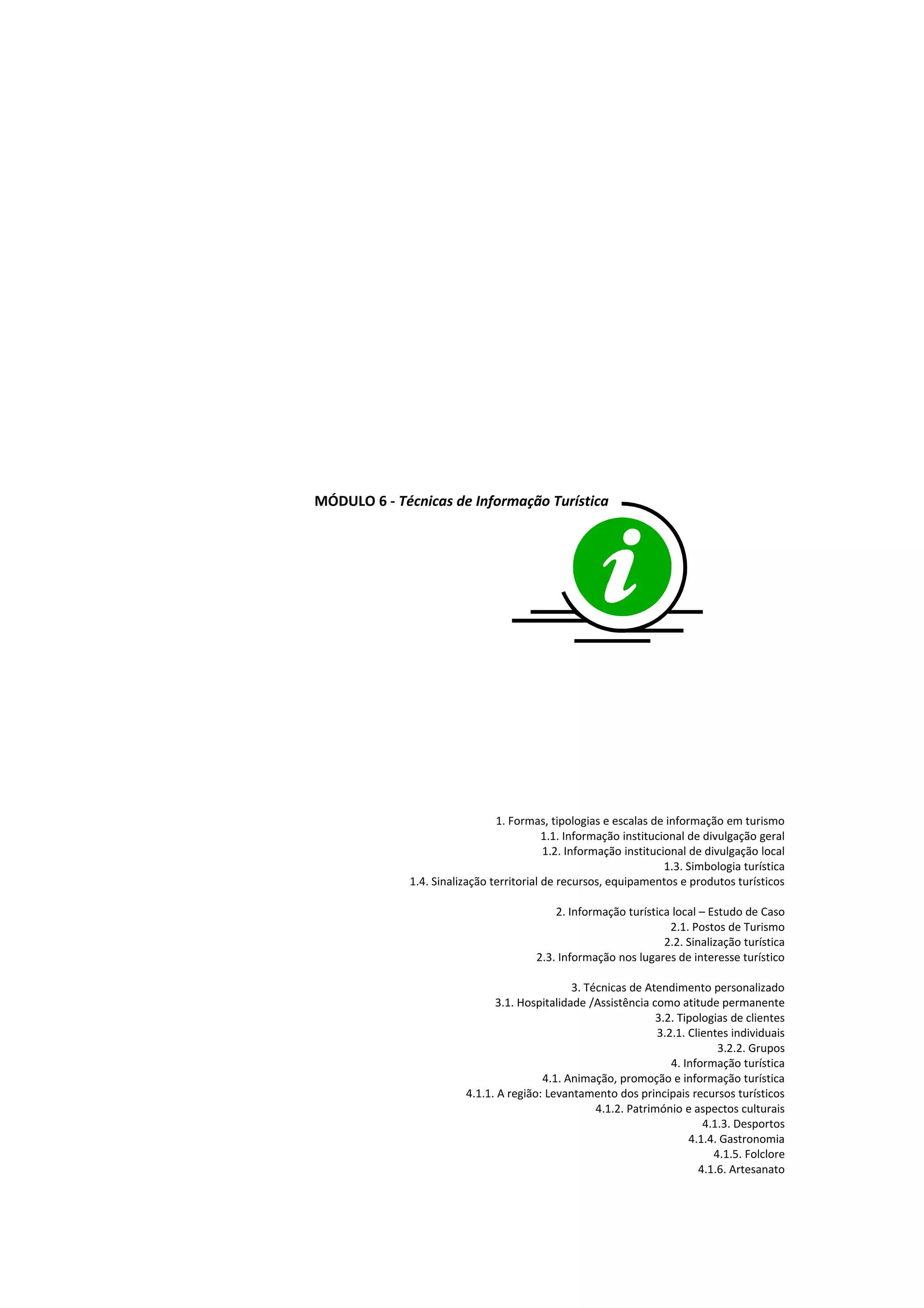 O documento discute técnicas de informação turística, incluindo formas de sinalização, informação institucional e local sobre atrações e serviços. Também aborda técnicas de atendimento personalizado ao cliente e a importância da hospitalidade no setor turístico.
