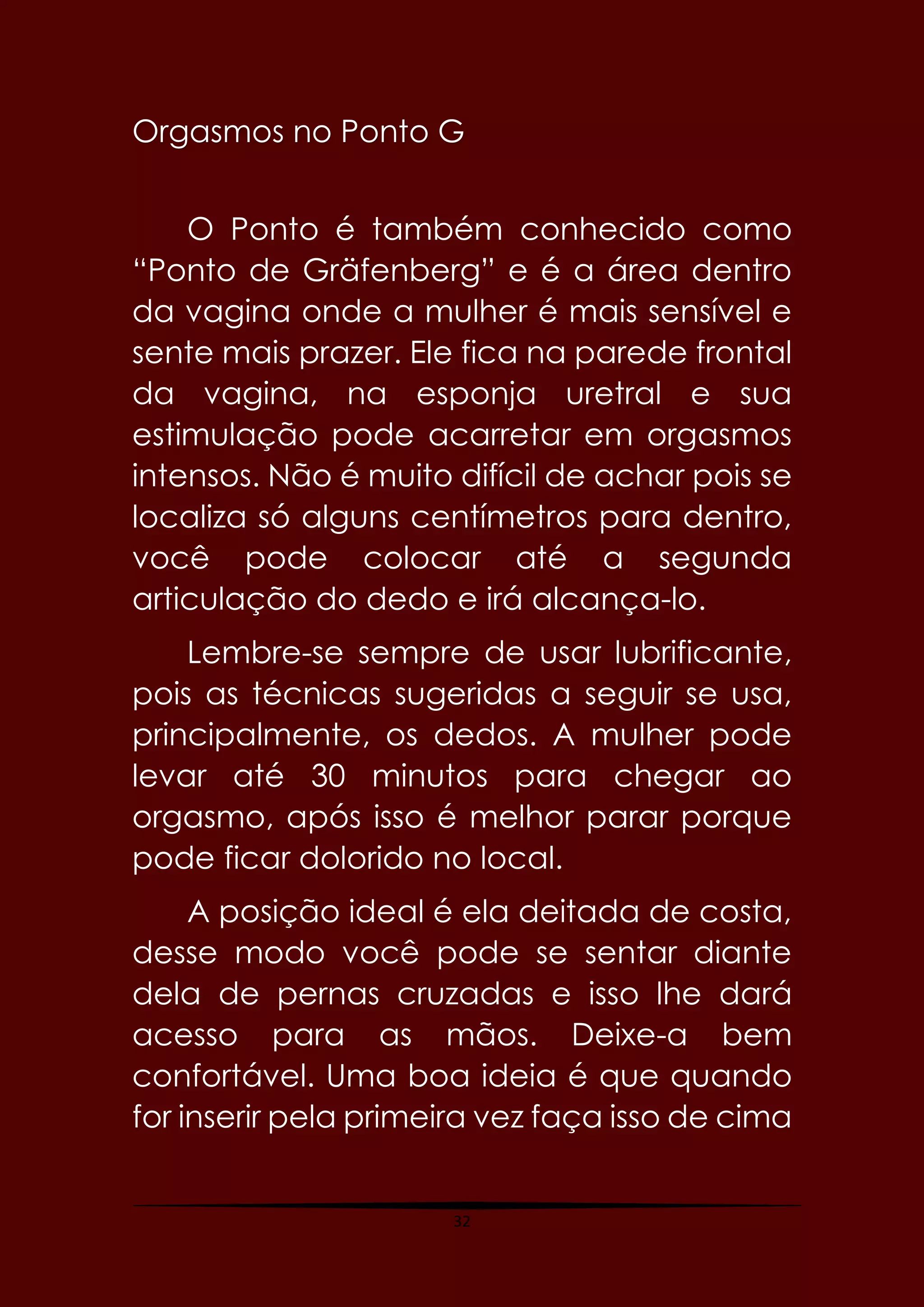 O documento fornece instruções sobre como estimular o ponto G durante o sexo para proporcionar orgasmos intensos à mulher. Ele descreve a localização do ponto G na parede frontal da vagina, técnicas manuais usando os dedos, como movimentos circulares e de vai-e-vem, e posições sexuais que facilitam a estimulação, como deitar de costas ou erguer os quadris.