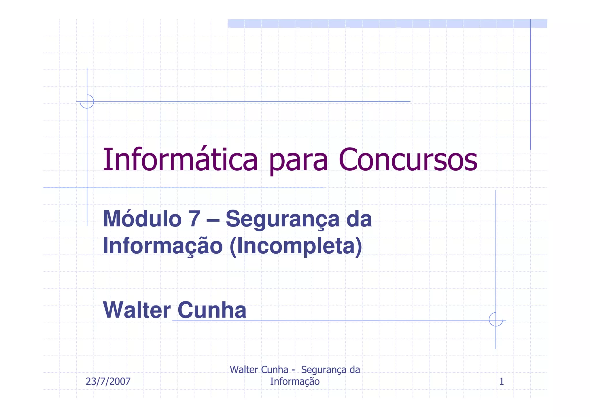 O documento apresenta um módulo sobre segurança da informação ministrado por Walter Cunha, abordando princípios como confidencialidade e integridade, ameaças como hackers, vírus e spywares, e conceitos como criptografia e certificação digital.