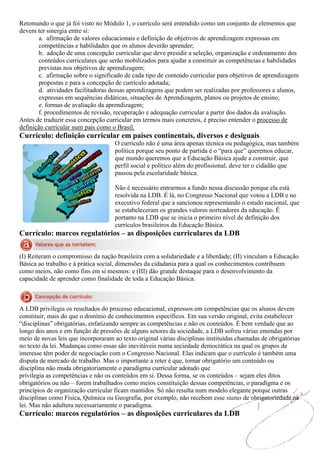 (I) O documento discute os marcos regulatórios do currículo no Brasil, incluindo a Lei de Diretrizes e Bases (LDB) e as Diretrizes Curriculares Nacionais (DCNs). (II) Ele explica que a LDB estabelece os objetivos gerais da educação básica brasileira e que as DCNs fornecem diretrizes para a elaboração de currículos nos estados e municípios. (III) O documento também analisa especificamente as DCNs para o Ensino Médio.