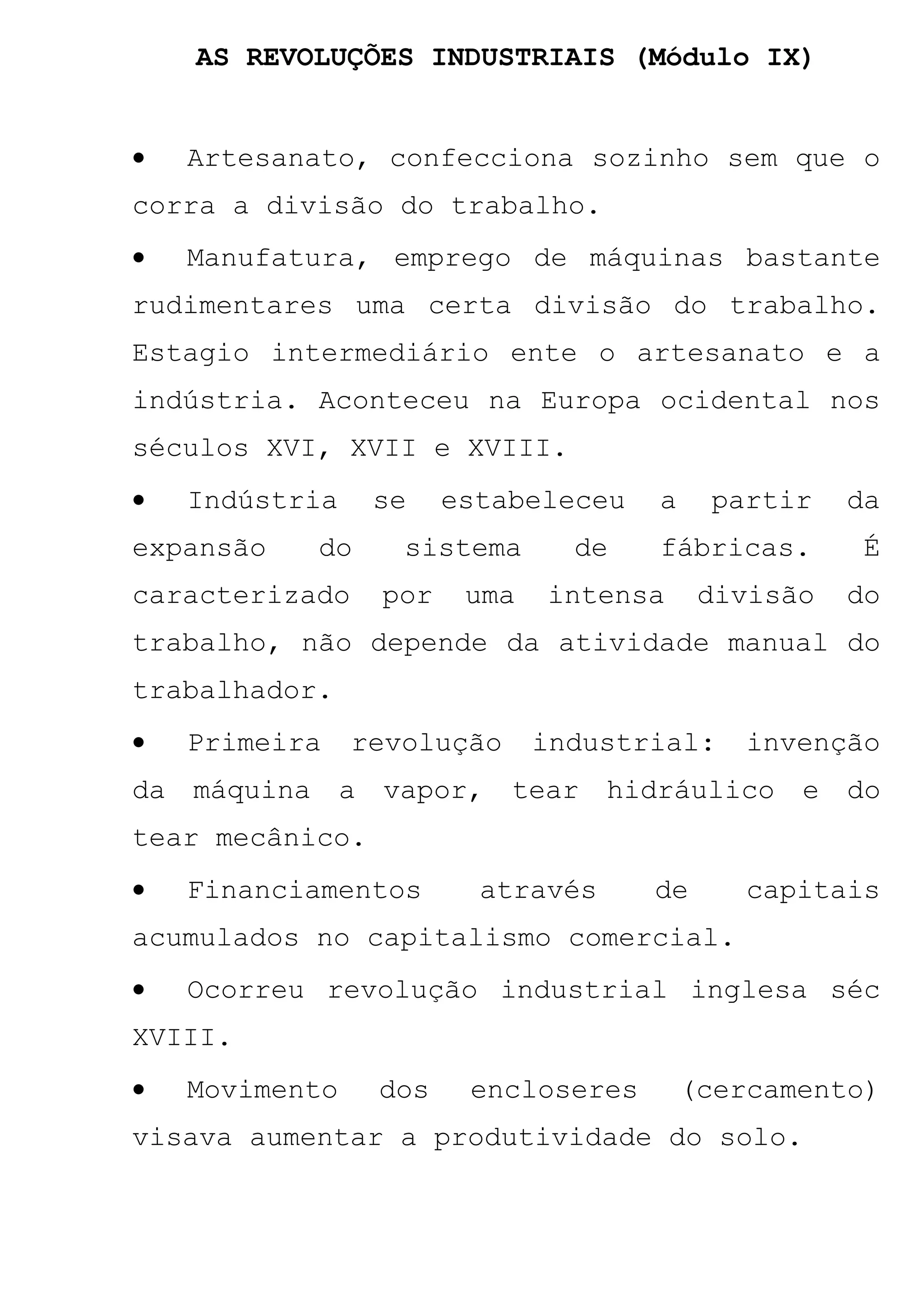 As três revoluções industriais transformaram a produção através da mecanização e automação do trabalho. A primeira introduziu a máquina a vapor no século 18 na Inglaterra. A segunda no século 19 expandiu o uso do carvão e petróleo e desenvolveu a siderurgia e metalurgia. A terceira desde o século 20 investe em pesquisa, tecnologia e automação através da robótica e informática.
