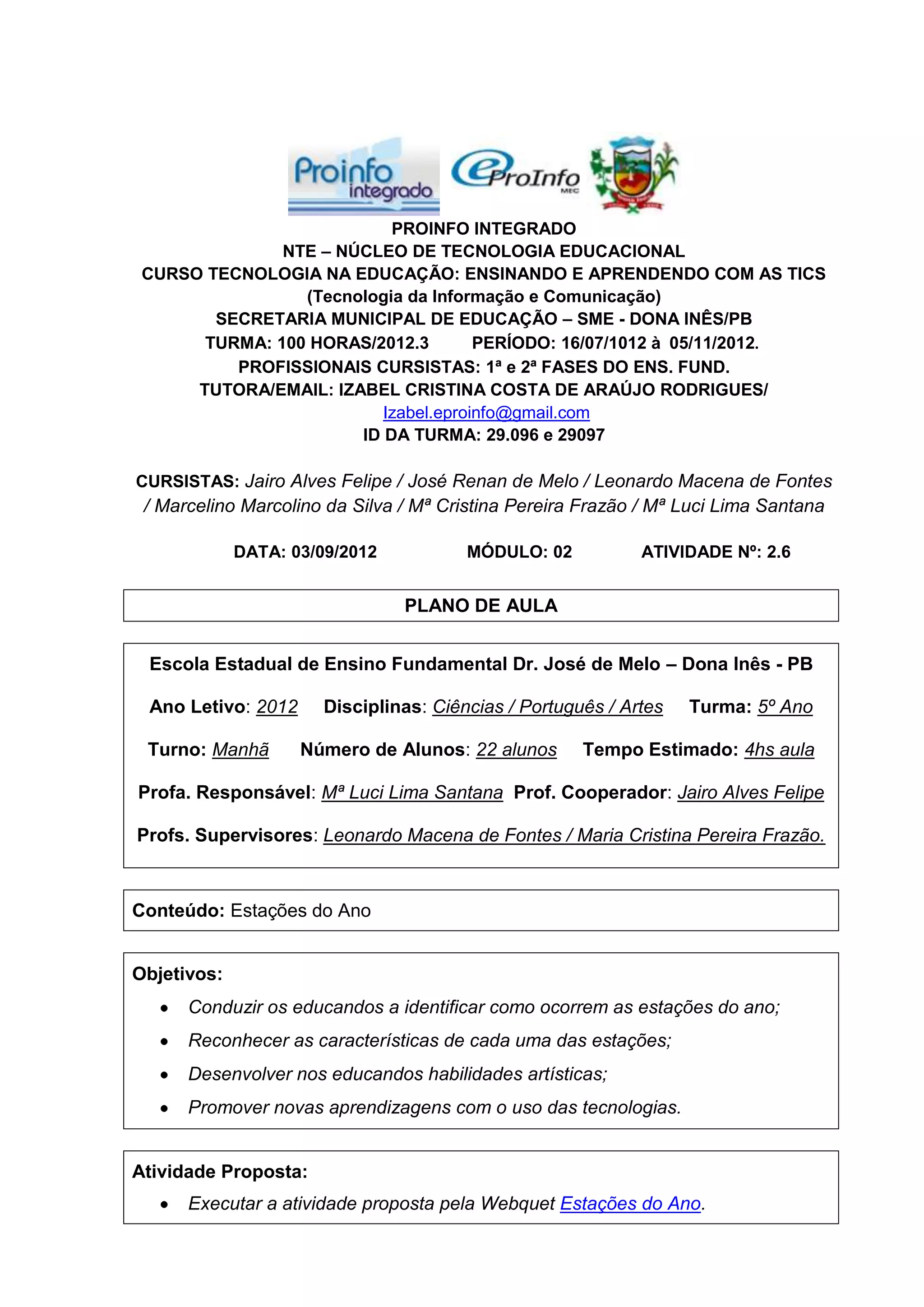 Este documento apresenta um plano de aula para estudantes do 5o ano sobre as estações do ano. O plano inclui objetivos como identificar as características de cada estação e desenvolver habilidades artísticas. A atividade proposta é uma webquest sobre as estações do ano. Os alunos serão divididos em grupos para realizar as tarefas da webquest e apresentar os resultados em PowerPoint. A avaliação observará o envolvimento, participação e criatividade dos alunos.