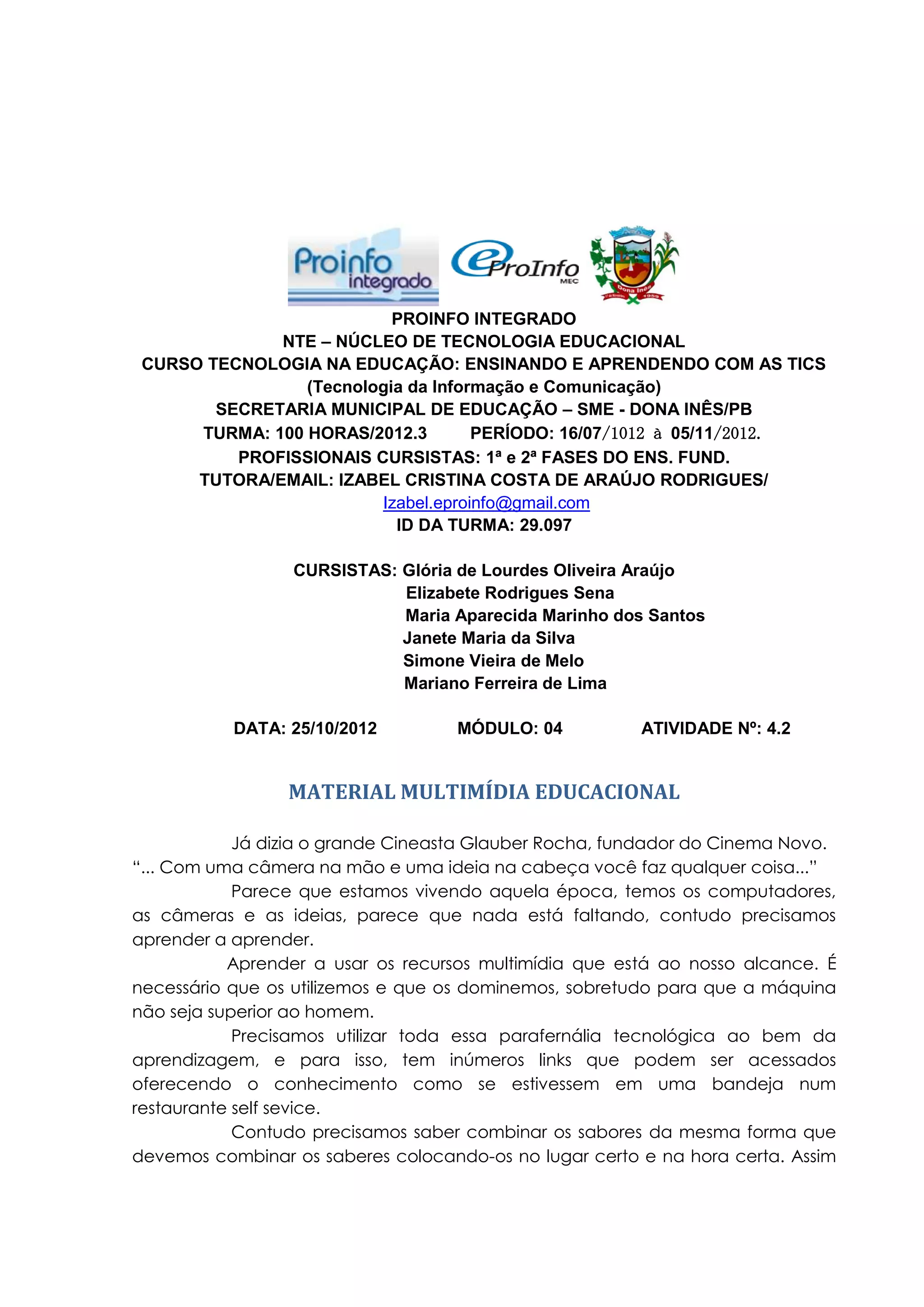 Este documento discute o uso de recursos multimídia na educação. Ele enfatiza que os professores precisam aprender a usar ferramentas como câmeras e computadores para melhorar o aprendizado, e não deixar que a tecnologia seja superior ao ser humano. Também destaca a importância de combinar diferentes recursos multimídia de forma a complementar o conhecimento, assim como se combina sabores em um restaurante self-service.