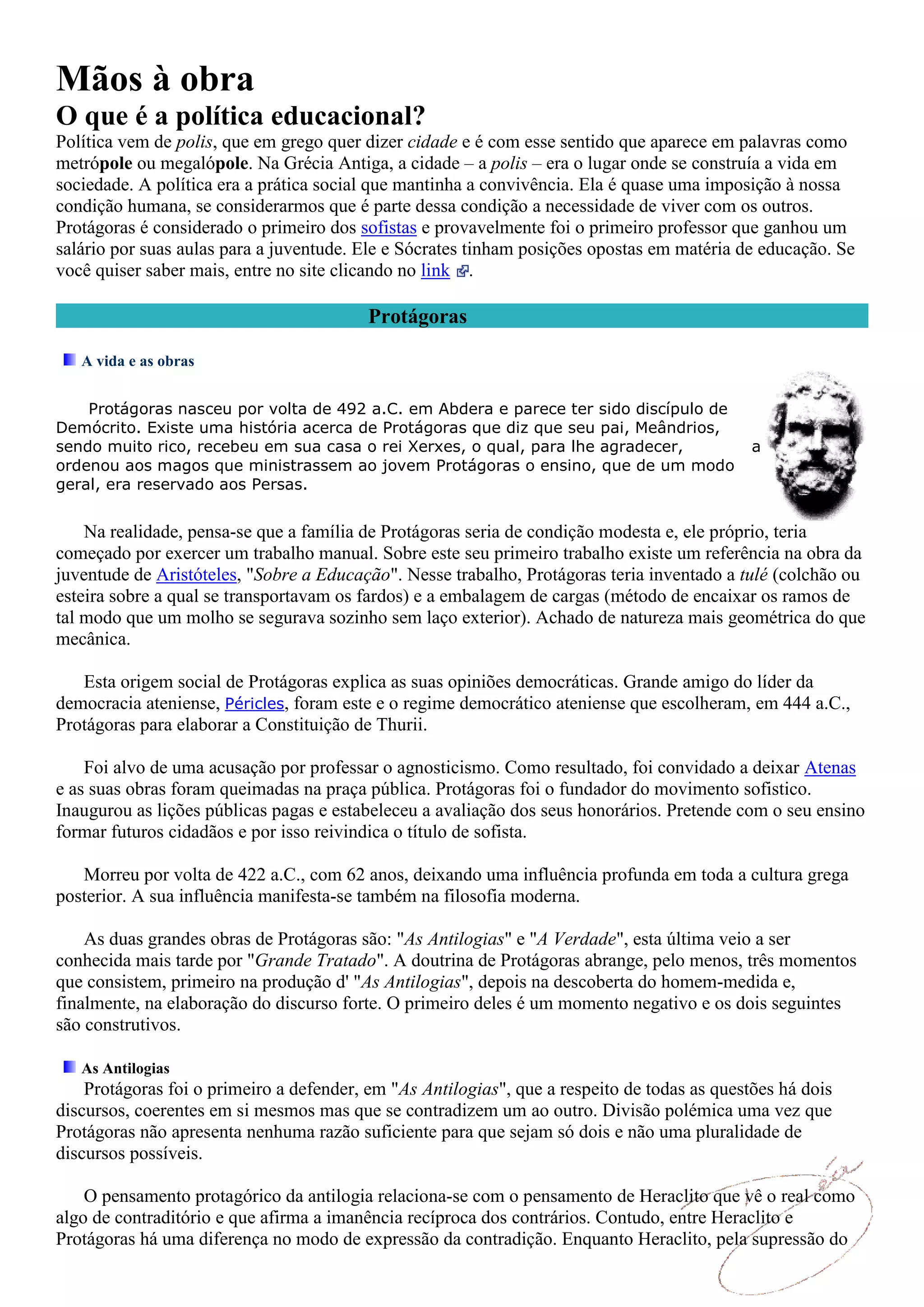 O texto discute o conceito de política educacional apresentado por Protágoras. De acordo com Protágoras, a política não é assunto apenas de especialistas, mas sim de todos os cidadãos, uma vez que é regida pela justiça e respeito. Atualmente, a política engloba também as políticas públicas, como a educacional, que requerem conhecimento técnico sobre estrutura e gestão governamental. Contudo, a política propriamente dita ainda influencia a definição dessas políticas através do processo decisório e priorização de recursos.