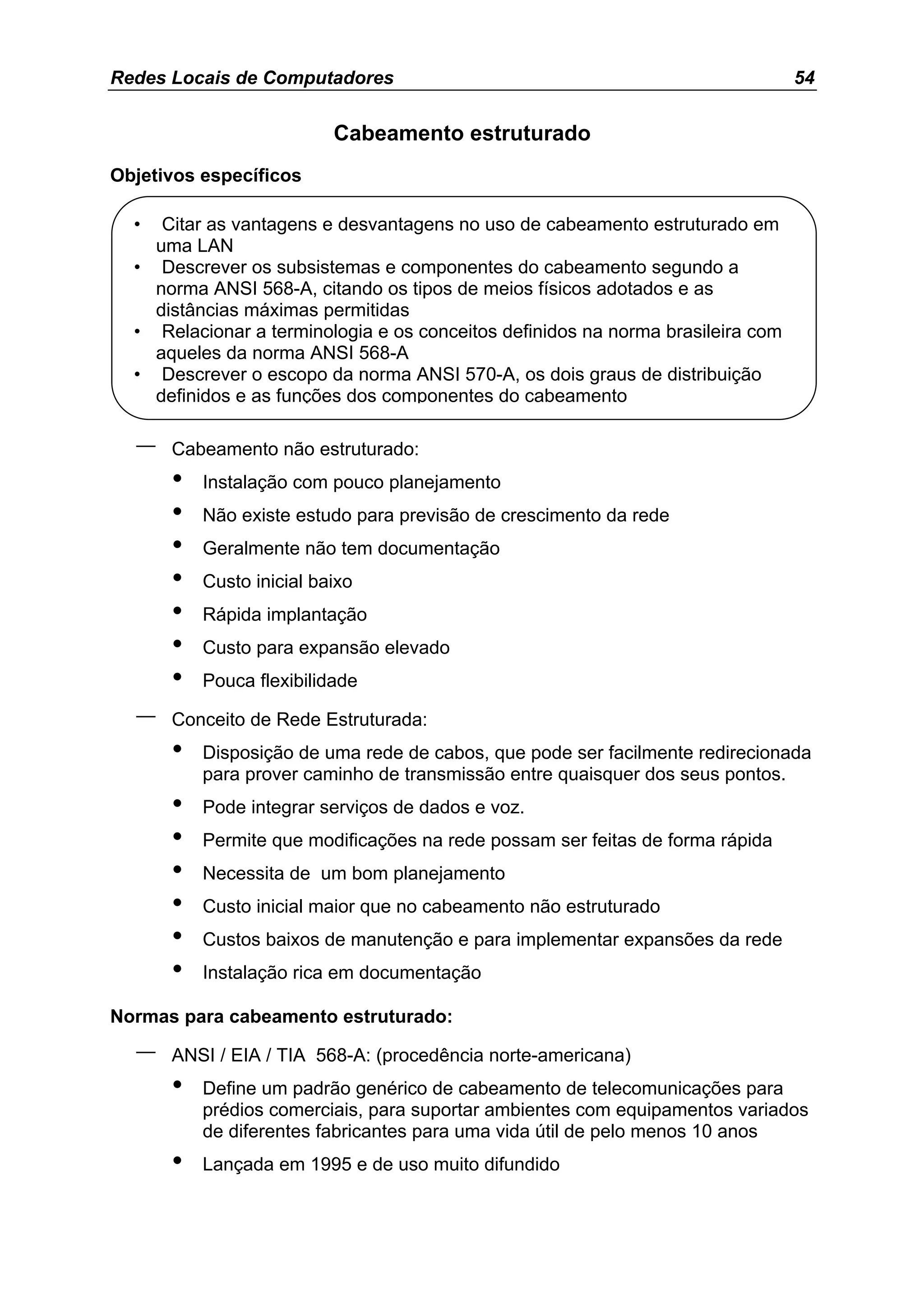O documento discute o cabeamento estruturado em redes locais, definindo seus conceitos, vantagens e componentes de acordo com normas como a ANSI/EIA-568-A. Inclui descrições dos subsistemas de cabeamento, categorias de cabos, fibra óptica, problemas comuns e diferenças com a norma brasileira.
