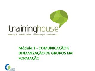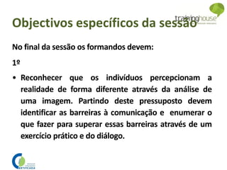 Este documento descreve os objetivos de uma sessão de formação sobre comunicação e dinamização de grupos. Os objetivos incluem: 1) Reconhecer barreiras à comunicação e como superá-las; 2) Compreender a dinâmica formador-formandos e a importância do feedback; 3) Reconhecer a importância de uma linguagem clara e objetiva e da comunicação não verbal.