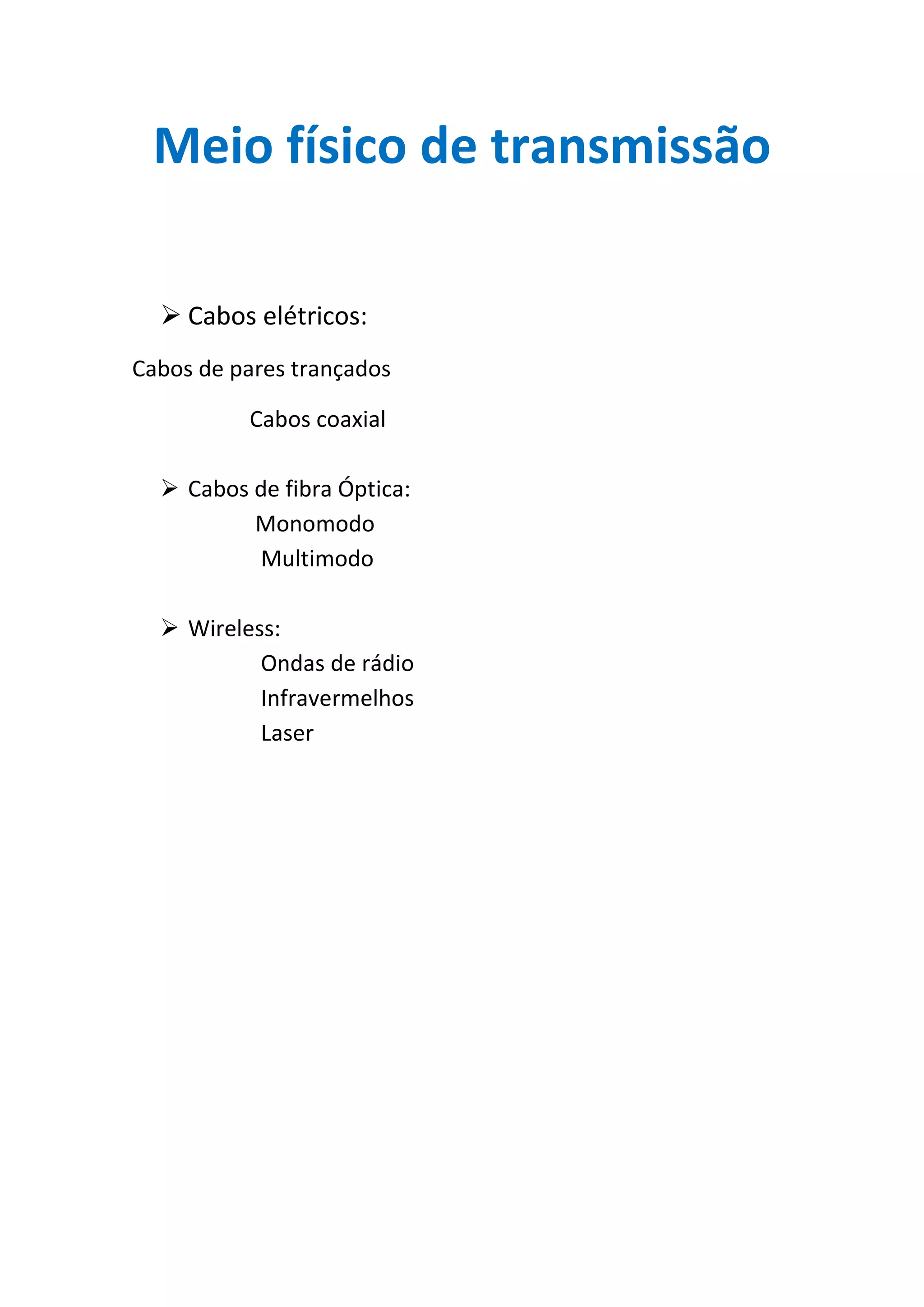 Este documento descreve os principais meios físicos de transmissão de dados, incluindo cabos (cabos de pares trançados como UTP e STP, cabos coaxiais e cabos de fibra óptica monomodo e multimodo) e sem fios (ondas de rádio, infravermelhos e laser). Cada meio possui vantagens e desvantagens em termos de distância, taxa de transmissão, custo e facilidade de instalação.