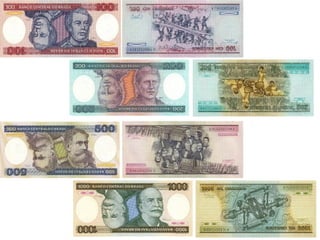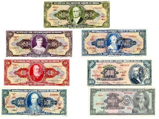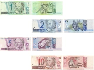 O documento descreve a evolução das moedas no Brasil desde 1833, mencionando as principais mudanças como a substituição do Mil-Réis pelo Cruzeiro em 1942, a introdução do Cruzeiro Novo em 1967 e do Real em 1994 como parte do Plano Real para combater a inflação. Resume também as equivalências entre as moedas anteriores e o Real.