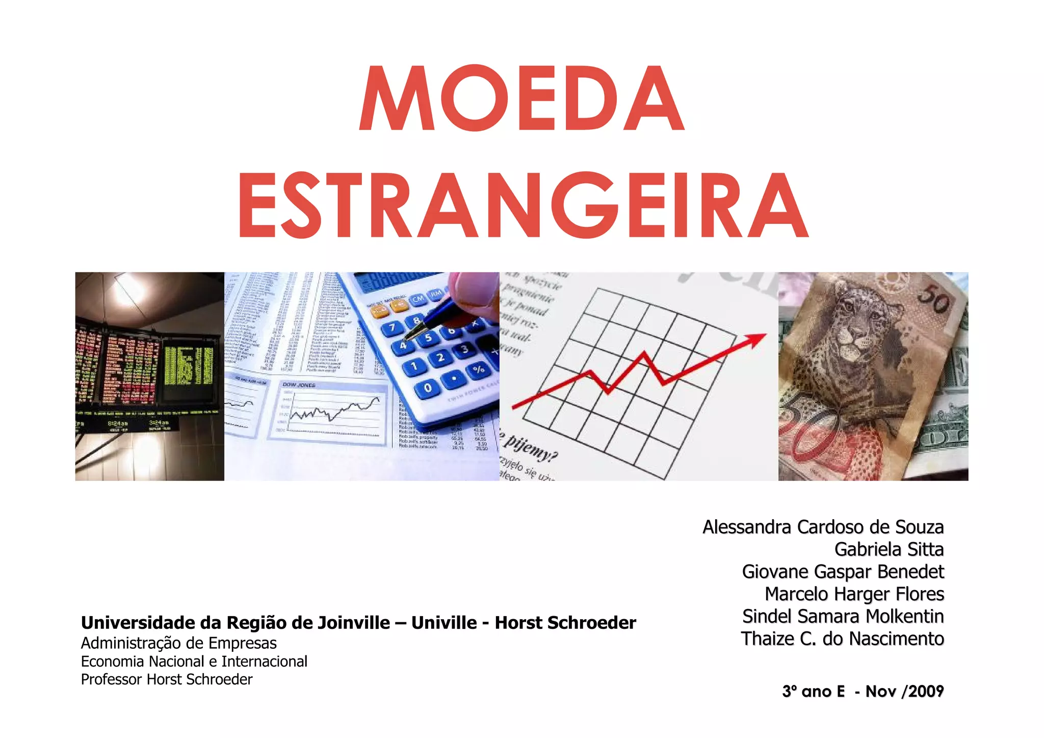 O documento discute moedas estrangeiras, incluindo taxas de câmbio de moedas como o dólar, peso mexicano, franco suíço e iene japonês. Também aborda o mercado de câmbio, tipos de transações como à vista e a termo, e principais bancos envolvidos no mercado de câmbio. Por fim, explica conceitos como valorização e desvalorização da taxa de câmbio e especulação no mercado de câmbio.