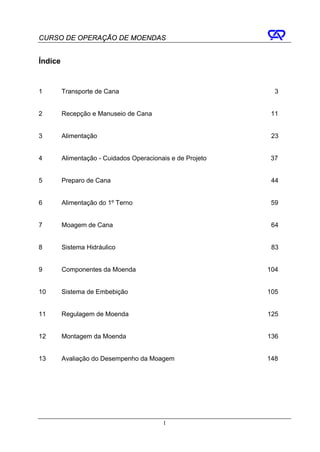 O documento discute o transporte de cana-de-açúcar para usinas, cobrindo os principais meios de transporte (caminhões, trens), tipos de carrocerias usadas, e sua capacidade de carga. Ele fornece detalhes técnicos sobre como carregar e descarregar cana inteira e picada usando diferentes configurações de veículos e equipamentos.
