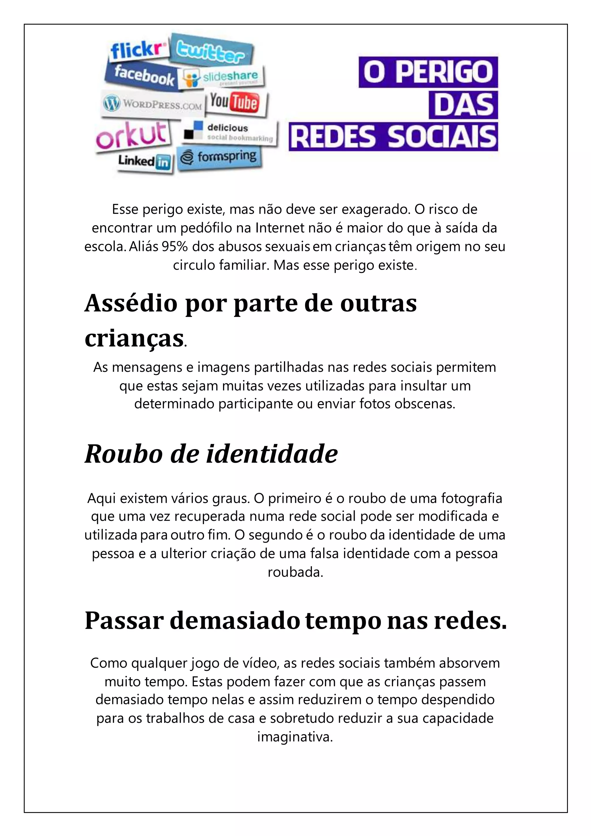 O documento discute quatro riscos potenciais do uso de redes sociais por crianças: 1) o risco de encontrar um pedófilo online não é maior do que fora da internet, embora 95% dos abusos venham de familiares; 2) assédio por outras crianças através de mensagens e imagens compartilhadas; 3) roubo de identidade através da modificação e uso indevido de fotos; 4) passar muito tempo nas redes sociais pode reduzir o tempo para estudos e imaginação.