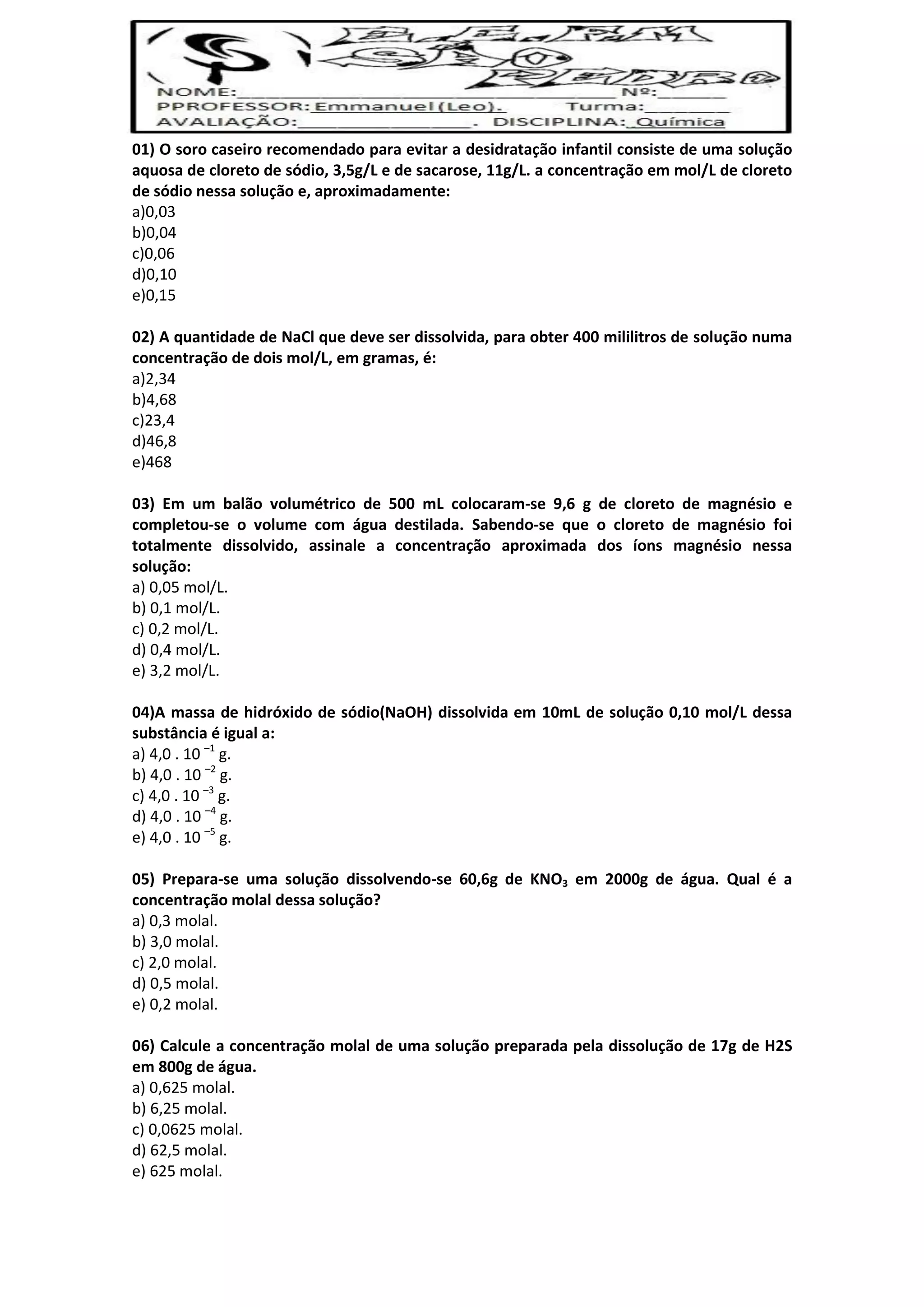 O documento discute a preparação de soluções aquosas de diferentes substâncias químicas e o cálculo de suas concentrações molares ou molais. As questões abordam a concentração de cloreto de sódio em soro caseiro infantil, a quantidade de NaCl necessária para obter uma solução de concentração 2 mol/L, e a concentração iônica de Mg em uma solução de cloreto de magnésio.