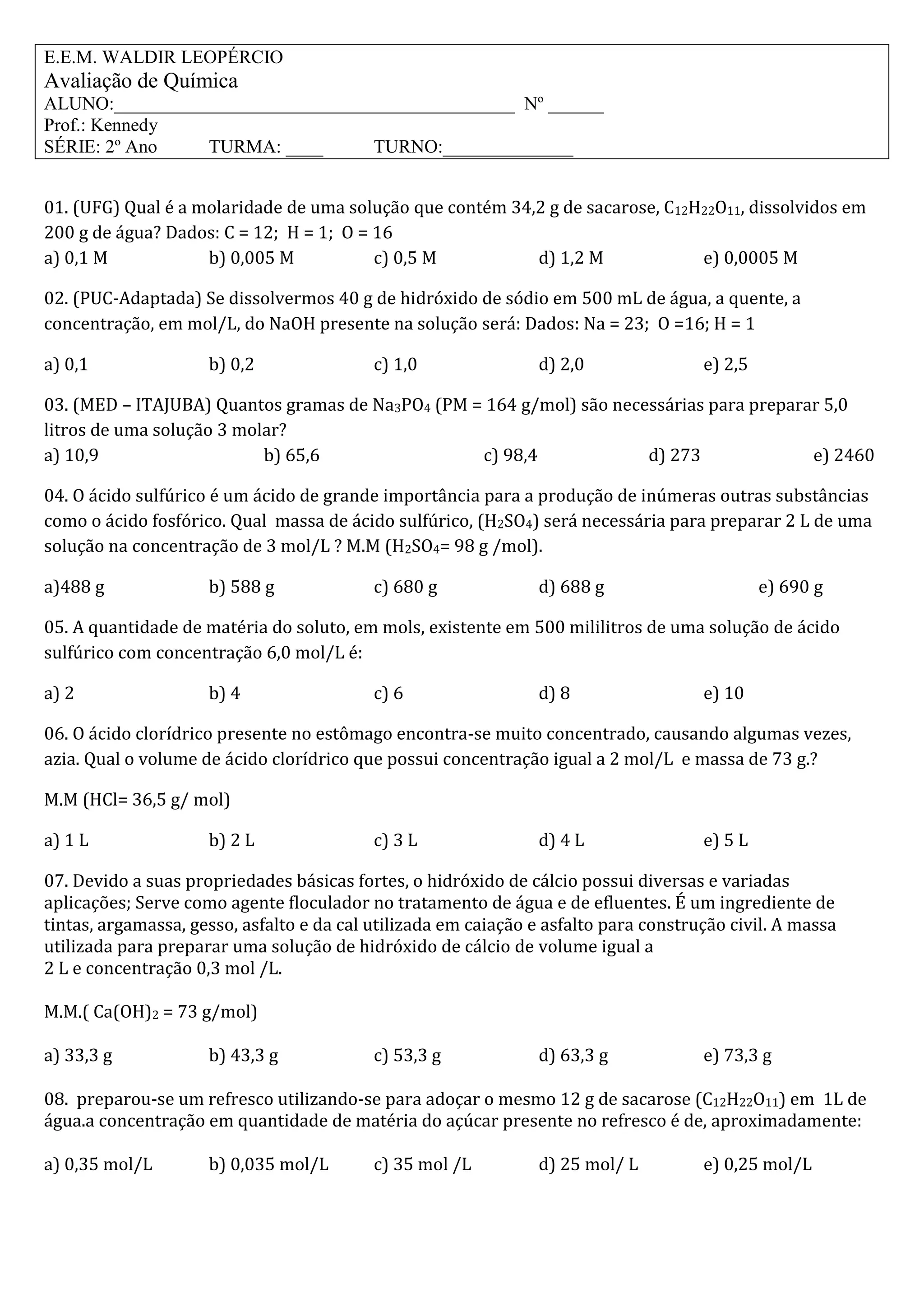 05. A quantidade de matéria do soluto, em mols, existente em 500 mililitros de uma solução de ácido