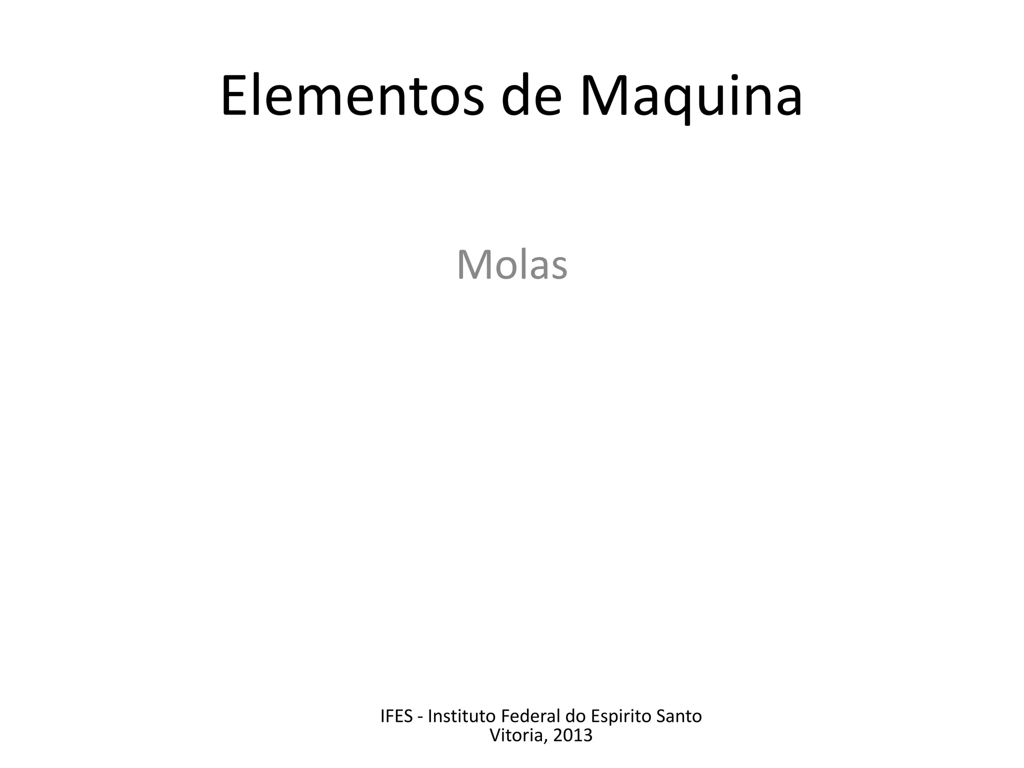 O documento discute os tipos principais de molas helicoidais: molas de compressão, tração e torção. As molas de compressão funcionam ao comprimir com uma força e as de tração ao puxar com uma força. As molas de torção têm suas espiras coladas e são usadas em aplicações que requerem força perpendicular ao eixo. Exemplos de uso de cada tipo são dados.