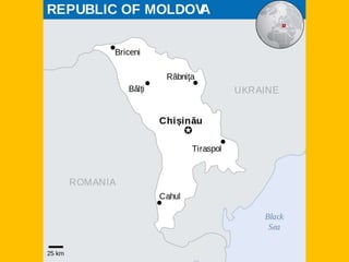 A Moldávia tem como capital Chisinau, e sua população inclui moldavos, ucranianos, russos e romenos. Sua história inclui períodos sob domínio húngaro, turco e russo, e atualmente sua língua oficial é o romeno.