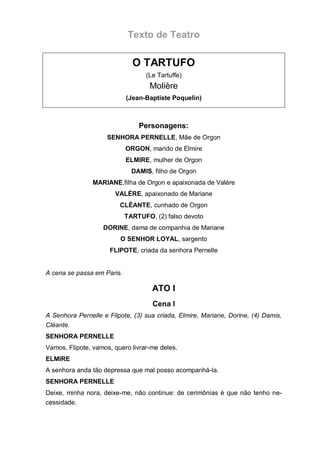 O documento apresenta uma cena da peça 'Tartufo' de Molière, onde personagens se encontram em um conflito gerado pela influência de Tartufo, um falso devoto, sobre Orgon, um dos cabeças da família. A Senhora Pernelle critica o comportamento da família, defendendo Tartufo, enquanto outros personagens expressam sua aversão a ele e questionam sua moralidade. O diálogo revela tensões familiares e a hipocrisia das aparências sociais.