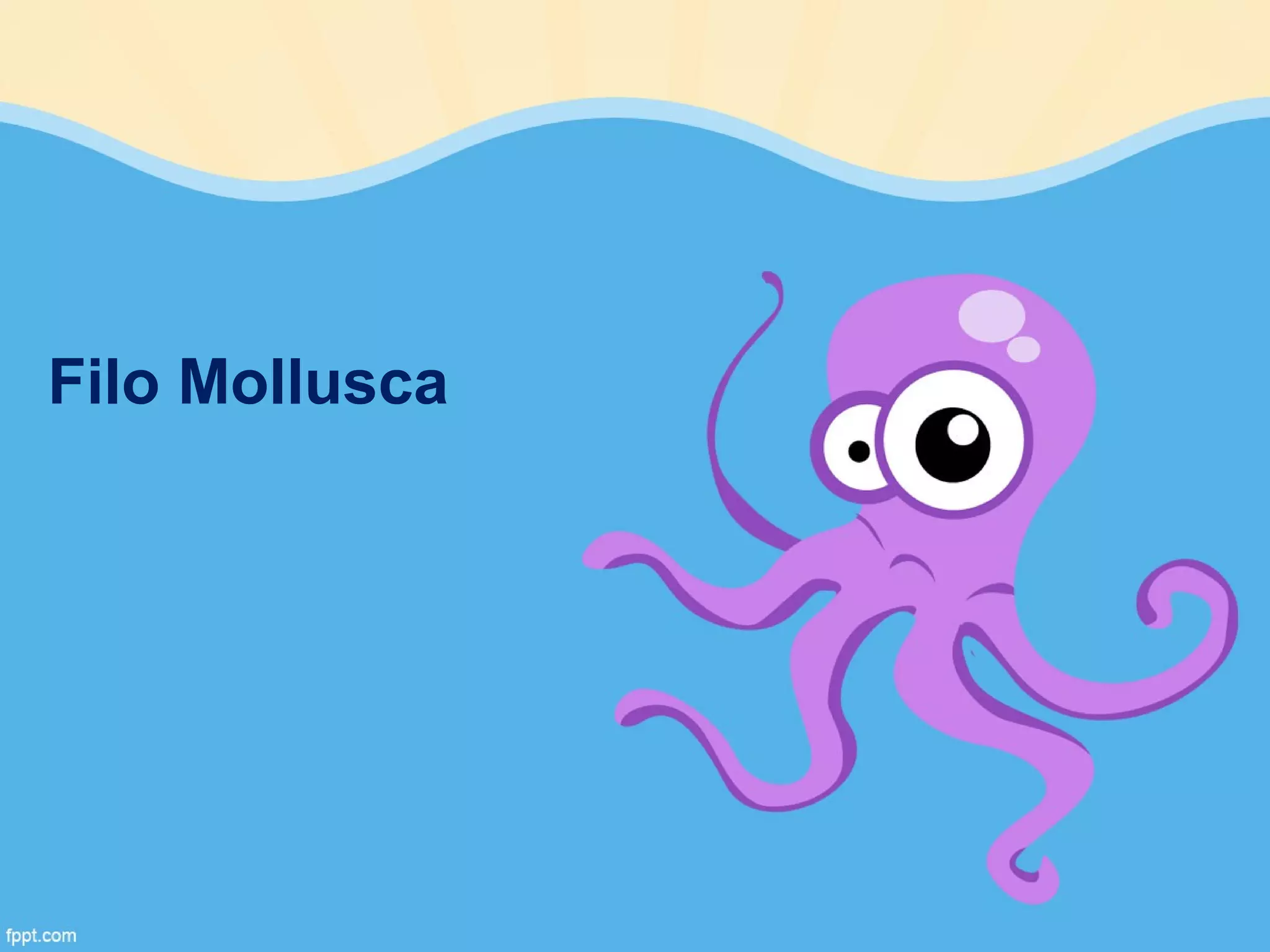 O documento descreve o filo Mollusca, incluindo suas principais classes (Gastrópodes, Bivalves e Cefalópodes), estrutura corporal, sistemas de digestão, circulação, respiração, excreção, reprodução e nervoso.