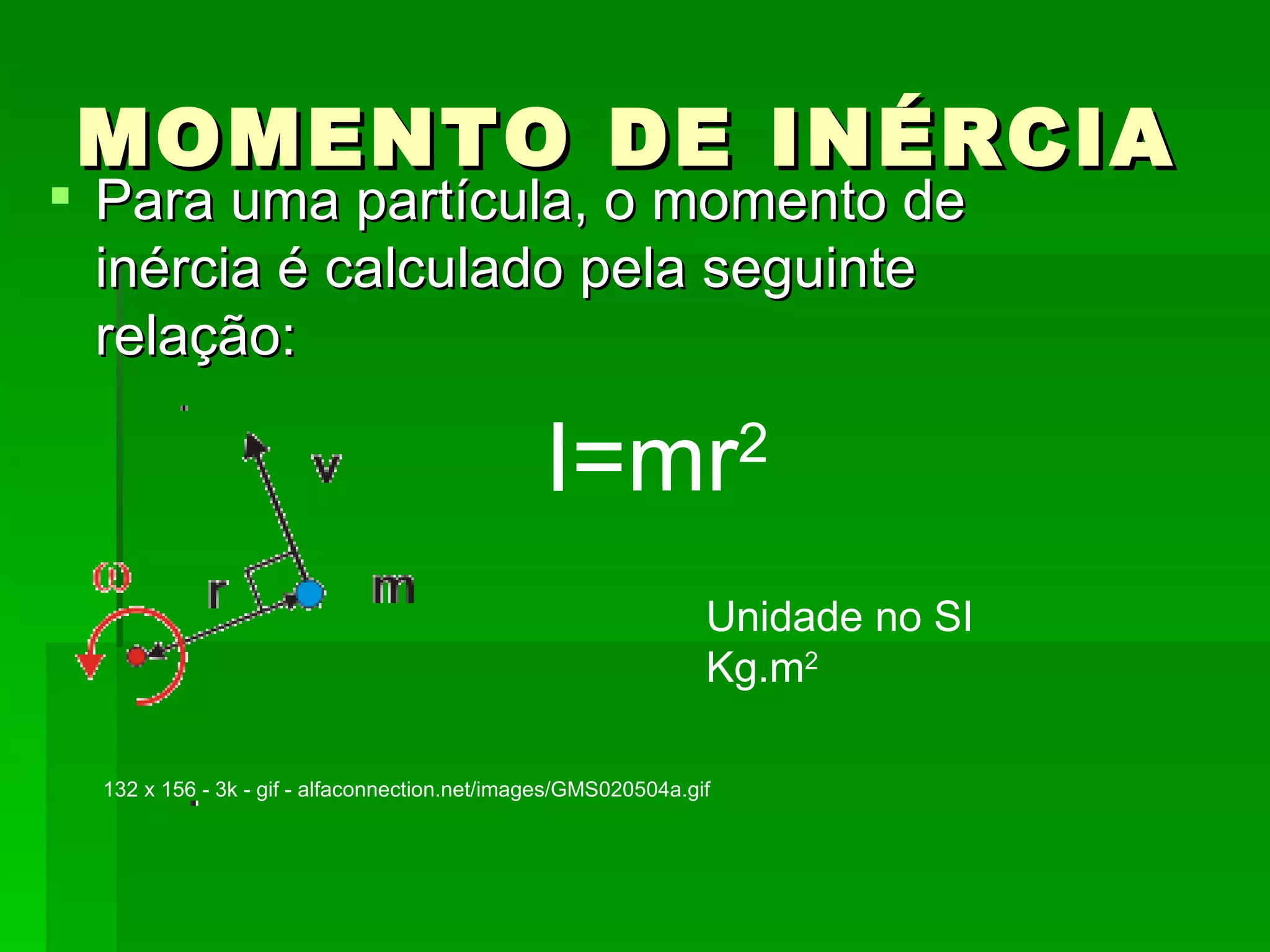 O documento descreve fórmulas para calcular o momento de inércia para diferentes objetos. Para uma partícula, é I=mr2. Para um corpo extenso, é I=∫r2 dm. Para uma haste fina, é I=ML2/12. Para um anel, é I=mr2/2.