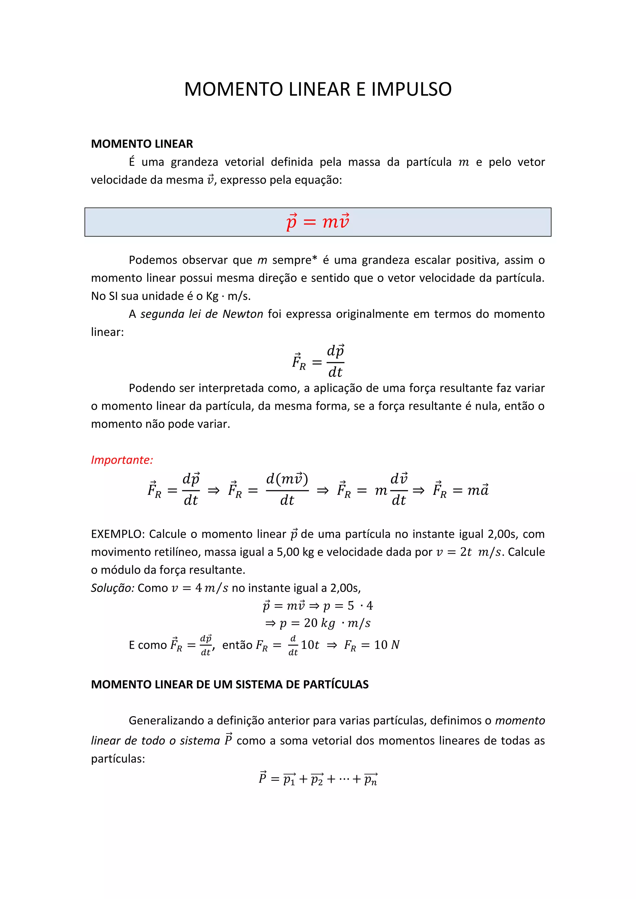 O documento descreve o momento linear e o impulso, definindo-os como a massa vezes a velocidade de uma partícula e a variação do momento linear devido a uma força aplicada ao longo do tempo, respectivamente. Ele também generaliza esses conceitos para sistemas de partículas e fornece exemplos numéricos de cálculos envolvendo momento linear e impulso.