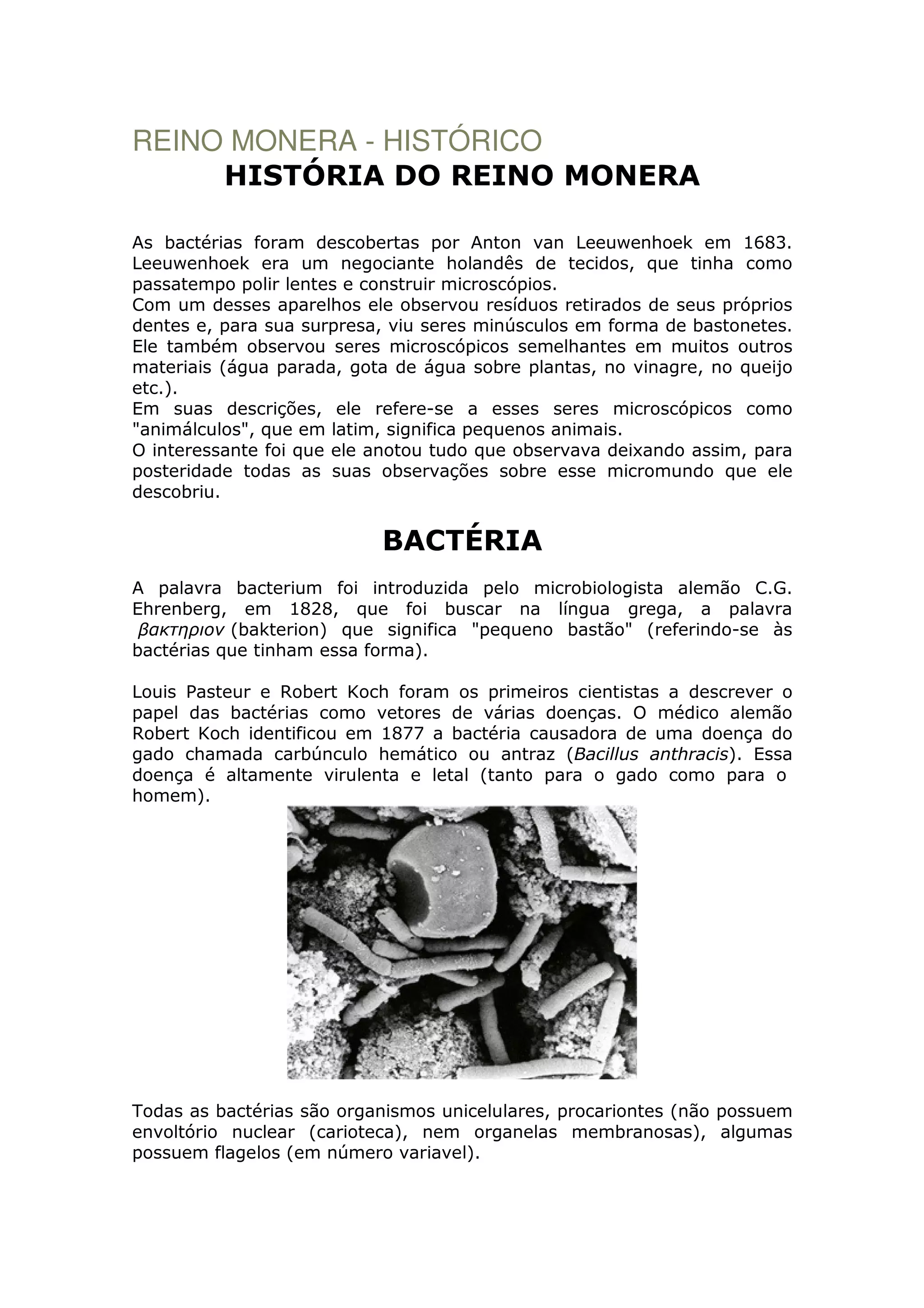 O documento descreve a história do reino Monera, começando com a descoberta das bactérias por Anton van Leeuwenhoek em 1683. Detalha as principais características das bactérias, incluindo sua classificação como organismos unicelulares procariontes. Também discute estromatólitos, estruturas formadas por bactérias que produzem oxigênio e tornaram a atmosfera da Terra respirável.