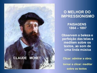 O documento apresenta obras do pintor impressionista Claude Monet acompanhadas de música e reflexões sobre lições de vida. O conteúdo inclui várias pinturas de paisagens de Monet de 1864 a 1897 para admiração e meditação, além de textos ensinando sobre aprendizados como a importância de aprender com os mais velhos, valorizar pequenos momentos e a necessidade de amor e apreciação.