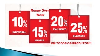 A Money Over Work oferece um sistema de afiliados inovador no mercado de marketing multinível, permitindo que os associados ganhem com compartilhamentos diários nas redes sociais. Os planos de adesão variam em valor e oferecem diferentes faixas de ganho mensal, com 100% dos associados sendo remunerados. A empresa também se destaca pela transparência fiscal, contabilidade própria e suporte ao associado, promovendo uma renda residual que garante maior segurança financeira.