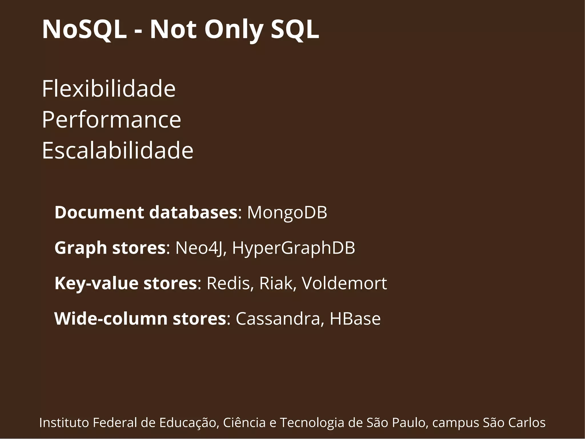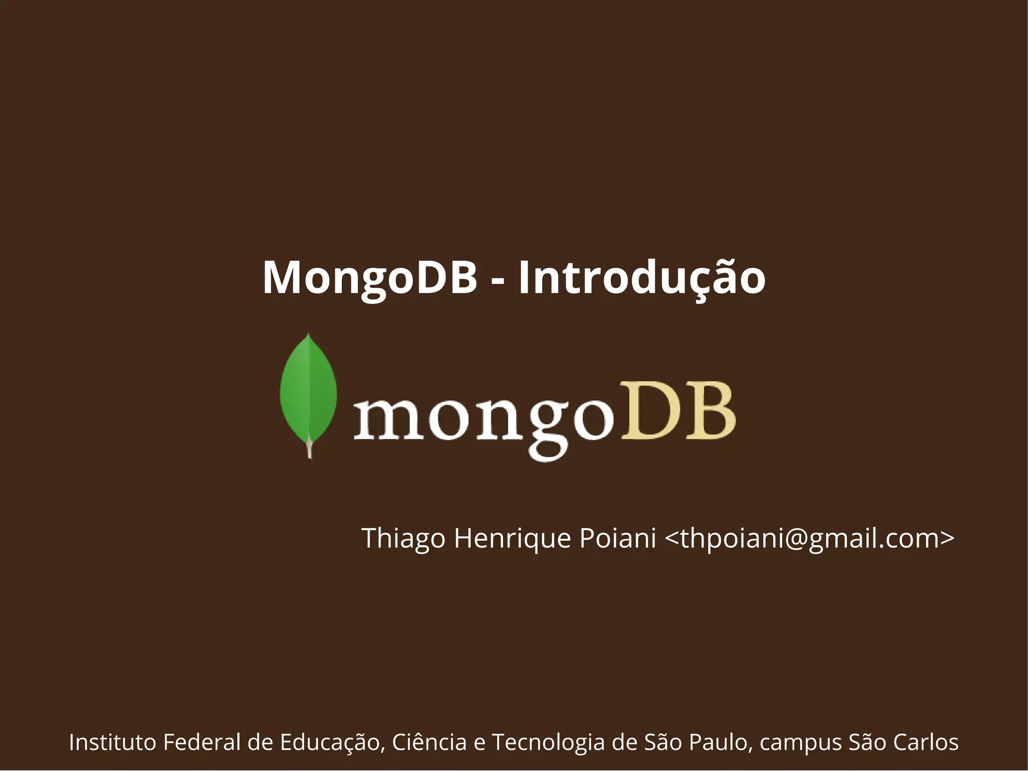 O documento introduz o MongoDB, um banco de dados NoSQL orientado a documentos. Ele descreve as principais características do MongoDB como a estrutura de dados JSON, a ausência de esquema, indexação, replicação e particionamento. Também compara o MongoDB com o SQL e mostra exemplos de consultas.
