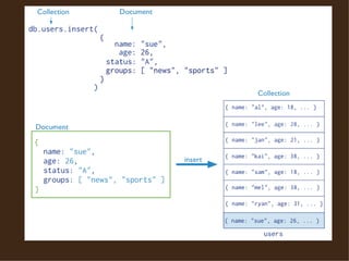 O documento introduz o MongoDB, um banco de dados NoSQL orientado a documentos. Ele descreve as principais características do MongoDB como a estrutura de dados JSON, a ausência de esquema, indexação, replicação e particionamento. Também compara o MongoDB com o SQL e mostra exemplos de consultas.