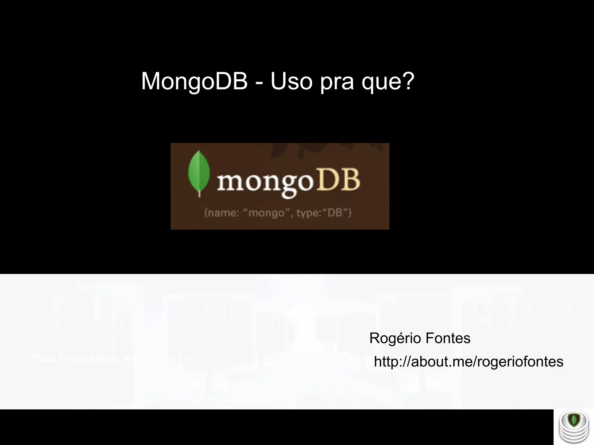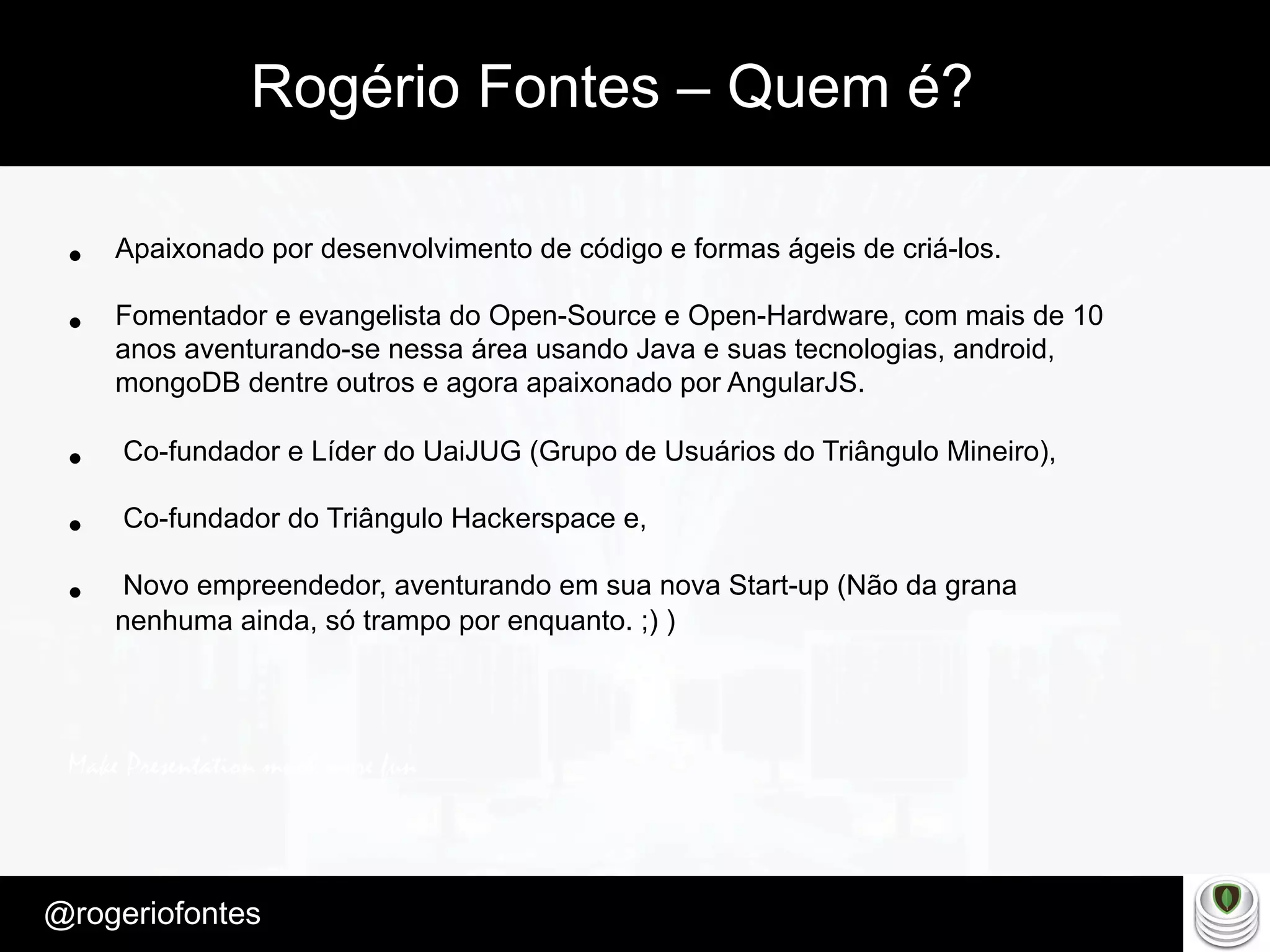 Rogério Fontes apresenta sobre MongoDB, incluindo: (1) Quem é Rogério Fontes e suas experiências com desenvolvimento de código; (2) Uma introdução ao MongoDB, comparando-o com bancos de dados relacionais e discutindo onde e como usá-lo; (3) Demonstração prática do uso de comandos básicos do MongoDB.