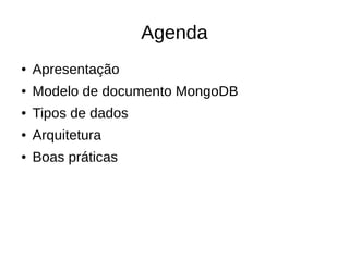 O documento apresenta os principais conceitos do MongoDB, incluindo modelo de documento, tipos de dados, arquitetura e boas práticas de schema design. O schema design é a chave para extrair o máximo de informações com poucas queries, considerando a eficiência de gravação e leitura.