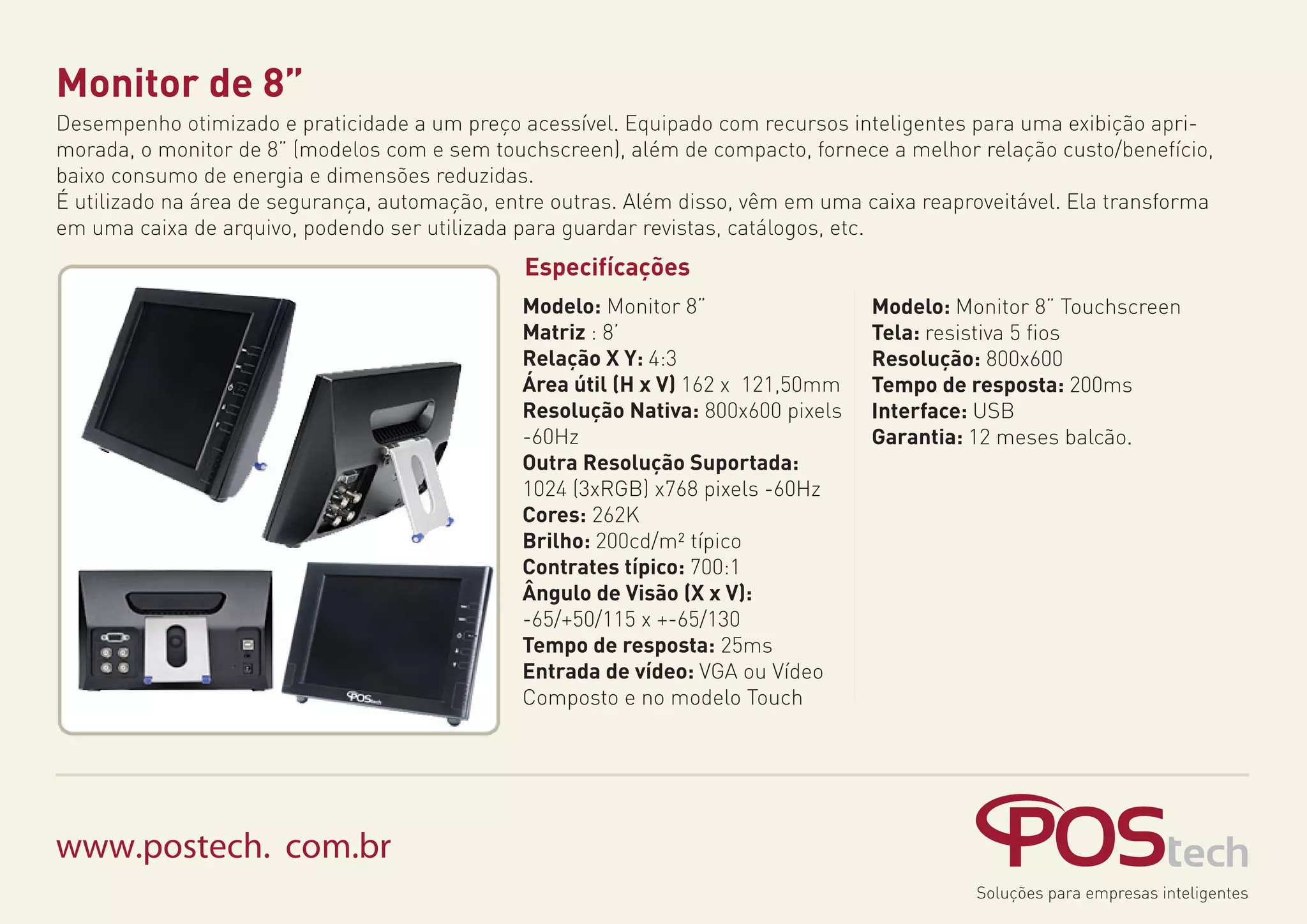 O documento descreve um monitor de 8 polegadas com desempenho otimizado e baixo consumo de energia para uso em aplicações de segurança e automação a um preço acessível. Ele vem em uma caixa que pode ser usada para armazenar itens e tem especificações técnicas como resolução de 800x600 pixels, brilho de 200cd/m2 e tempo de resposta de 25ms.