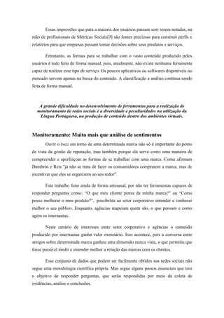 O monitoramento de redes sociais é essencial para entender a percepção do consumidor em relação às marcas, permitindo mensurar, classificar e analisar conteúdos gerados pelos usuários. Apesar da falta de ferramentas automatizadas eficazes, as agências utilizam métodos manuais para extrair insights valiosos que ajudam na gestão da reputação e na tomada de decisões corporativas. O monitoramento se tornou uma necessidade competitiva, oferecendo às empresas a capacidade de responder proativamente a crises e compreender melhor as necessidades dos consumidores.