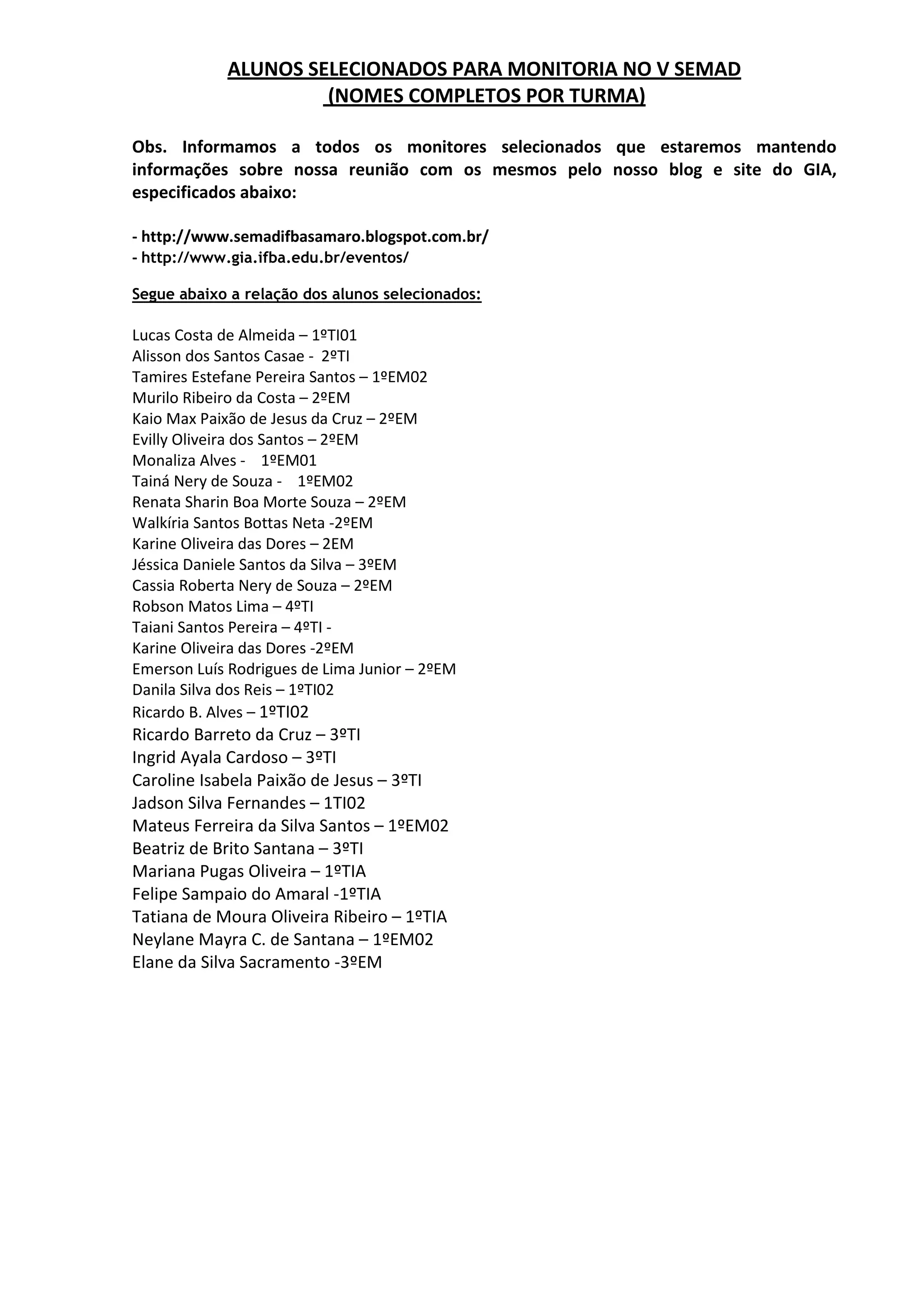 A lista contém os nomes de estudantes selecionados para monitoria no 5o semestre de diferentes cursos técnicos integrados e em eletromecânica, incluindo seus respectivos períodos letivos. Informações adicionais sobre reuniões com os monitores serão postadas em sites especificados.