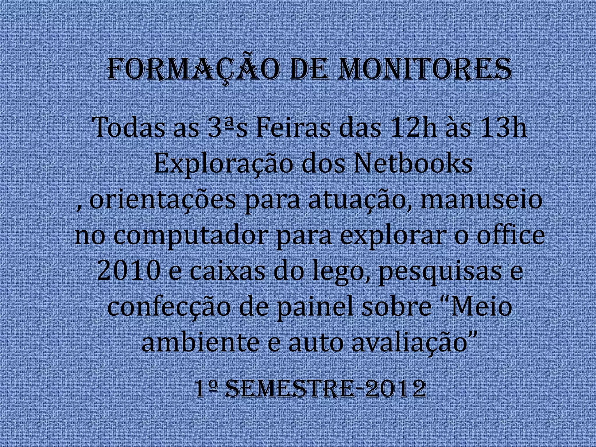 Formação de monitores ocorre todas as terças-feiras das 12h às 13h para explorar netbooks, aprender a usar o Office 2010 e construir com Lego, além de pesquisar e criar painéis sobre meio ambiente e autoavaliação no primeiro semestre de 2012.