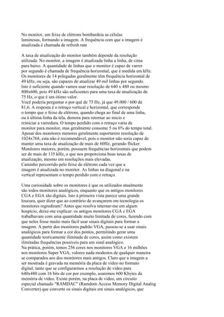 O documento discute os principais componentes e características dos monitores, comparando monitores CRT tradicionais e LCD. Os monitores LCD oferecem vantagens como menor tamanho, peso e consumo de energia, mas também limitações como ângulo de visão restrito e custo mais elevado.