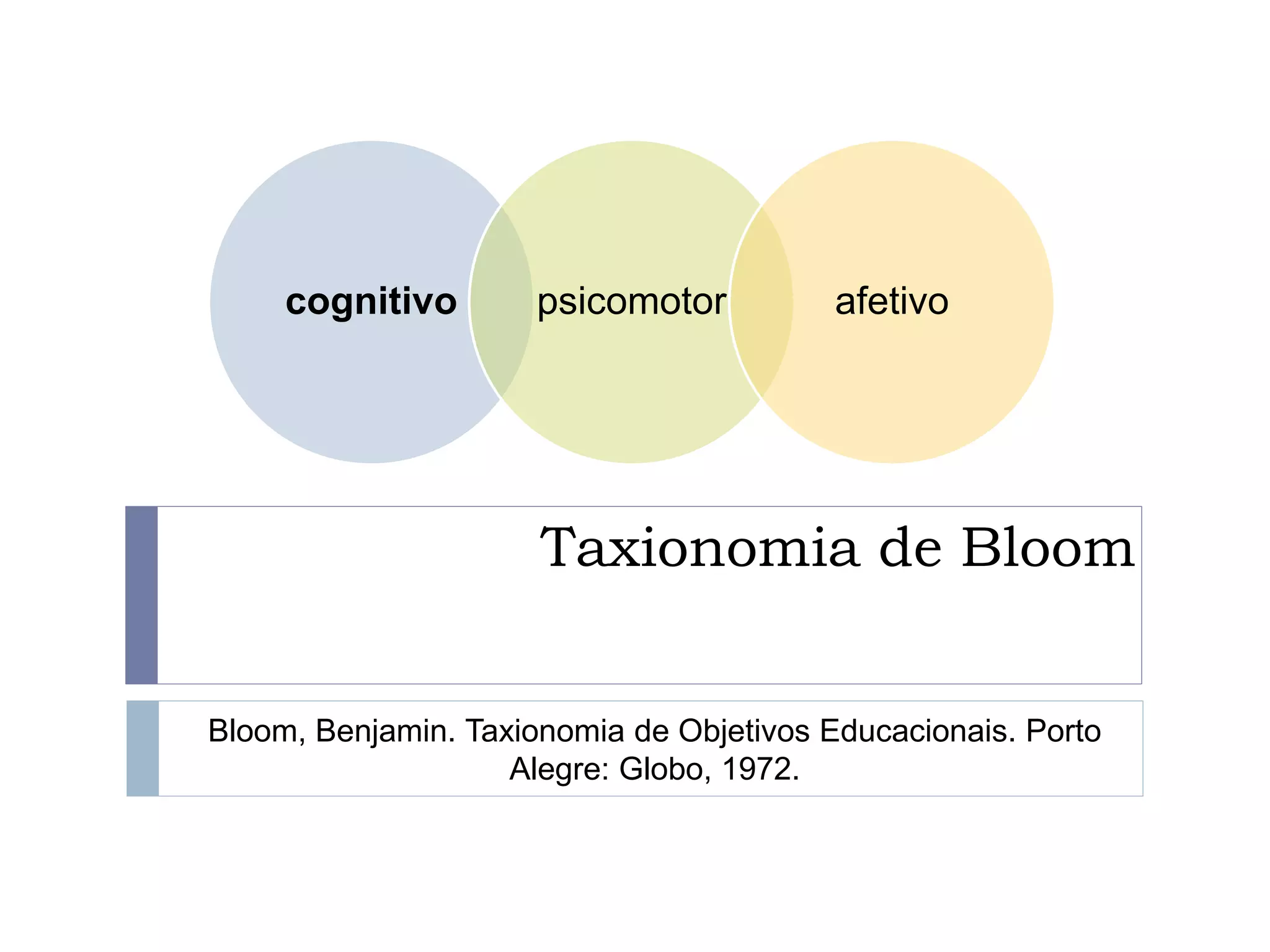Este documento descreve a Taxionomia de Bloom, um framework para classificar objetivos educacionais. A taxionomia categoriza os objetivos em três domínios: cognitivo, psicomotor e afetivo. O domínio cognitivo é subdividido em seis categorias de conhecimento a avaliação. Exemplos ilustram como objetivos educacionais podem ser classificados neste framework.