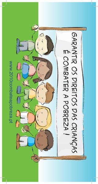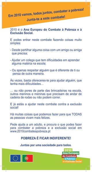 O documento descreve como as crianças podem ajudar a combater a pobreza e a exclusão social através de ações simples como compartilhar com amigos necessitados, ajudar colegas que precisam de apoio escolar, respeitar os diferentes e oferecer ajuda a quem tem mais dificuldades. O ano de 2010 foi declarado o Ano Europeu do Combate à Pobreza e à Exclusão Social e o site www.2010combateapobreza.pt fornece mais informações sobre como participar deste esforço.