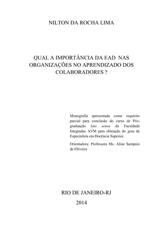 A monografia investiga a importância da Educação a Distância (EAD) como ferramenta no aprendizado dos colaboradores dentro das organizações, destacando suas vantagens em termos de flexibilidade, redução de custos e aumento da eficácia na capacitação. O autor baseia-se em revisão bibliográfica e práticas observadas em empresas que adotaram a EAD, enfatizando seu papel como motivador de crescimento profissional e sua aplicação na formação de adultos. O trabalho conclui que a EAD representa uma alternativa significativa para atender às necessidades educacionais em um ambiente organizacional dinâmico.