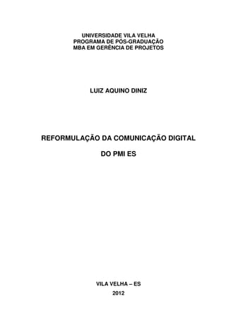 O documento apresenta a reformulação da comunicação digital do PMI no Espírito Santo, Brasil, visando aumentar a interatividade com os usuários na internet. Utilizando as diretrizes do W3C, propõe a criação de um website e perfis em mídias sociais, com ênfase na comunicação de mão dupla com os stakeholders. O projeto destaca a importância da comunicação digital como uma estratégia valiosa para as organizações na era da informação.