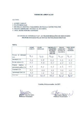O documento é uma monografia que explora a evolução do rádio para a web rádio no contexto das novas tecnologias digitais e sua influência nas interações sociais e comunicacionais. A pesquisa analisa como a web rádio se posiciona como meio de comunicação na era da cibercultura, questionando se seus ouvintes devem ser considerados ouvintes tradicionais ou internautas. A obra se fundamenta em teorias de renomados estudiosos, abordando a adaptação dos meios de comunicação frente à realidade da internet.