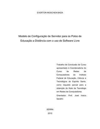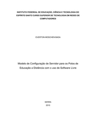 Este documento apresenta uma proposta de configuração de um servidor para os polos de Educação a Distância do Instituto Federal de Educação, Ciência e Tecnologia do Espírito Santo (IFES) utilizando a distribuição Linux ZeroShell. O servidor irá fornecer serviços como firewall, proxy, DHCP e rede Wi-Fi, utilizando software livre. O trabalho descreve a infraestrutura de rede dos polos do IFES e os requisitos do servidor proposto. Em seguida, apresenta os passos para configurar o servidor ZeroShell e seus servi