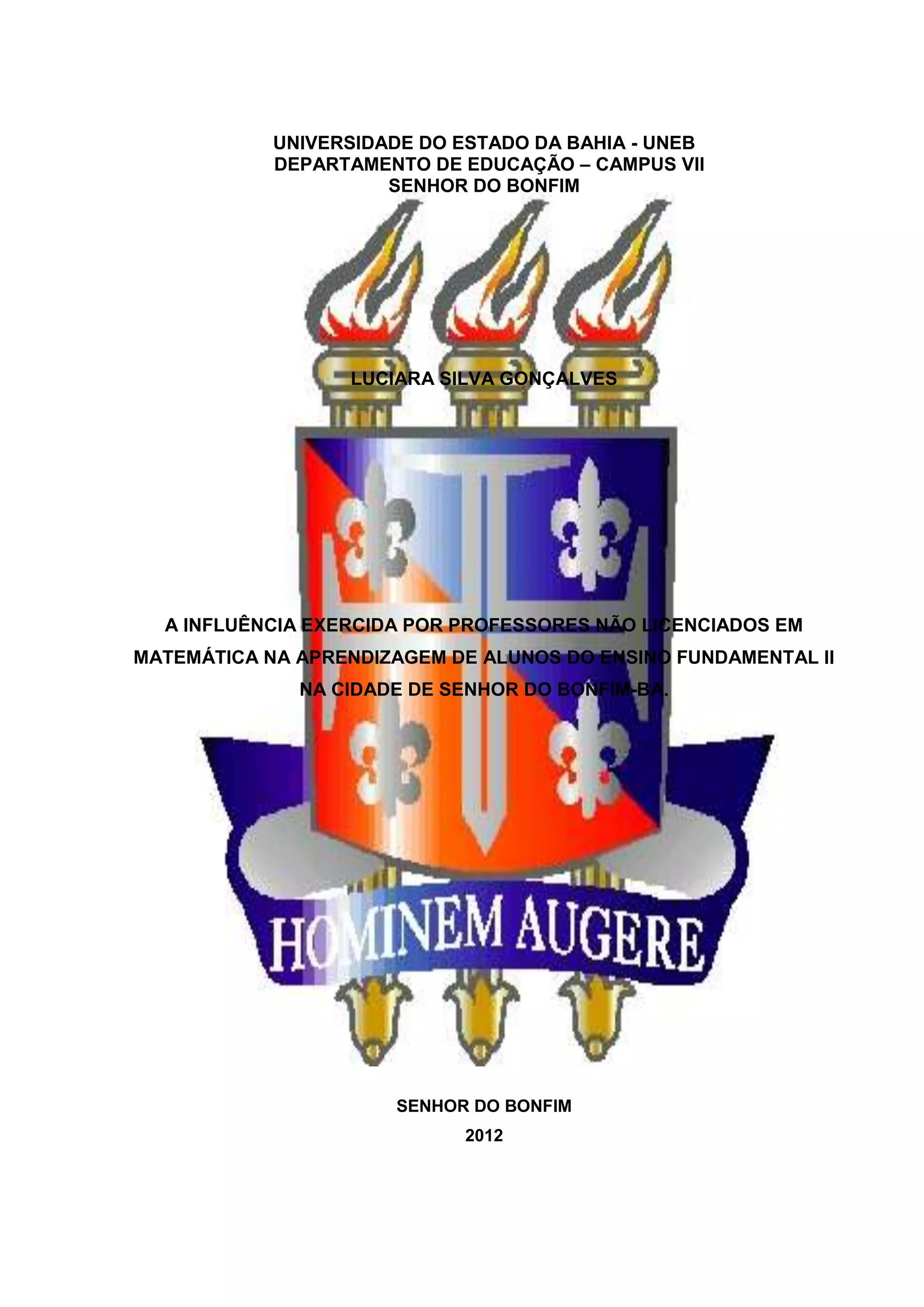 Este documento é uma monografia apresentada por Luciara Silva Gonçalves à Universidade do Estado da Bahia como requisito parcial para conclusão do curso de Licenciatura Plena em Matemática. A monografia investiga a influência exercida por professores não licenciados em matemática na aprendizagem de alunos do Ensino Fundamental II na cidade de Senhor do Bonfim, Bahia. O trabalho está dividido em quatro capítulos que abordam a problematização do tema, a fundamentação teórica sobre formação docente, ensino de