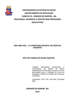 Este documento discute a importância da literatura infantil na prática pedagógica dos professores da educação infantil. Apresenta brevemente a história da literatura infantil e como ela era vista originalmente como uma forma de ensinar moral e bons costumes às crianças. Também reconhece que, embora a literatura infantil seja importante no desenvolvimento infantil, alguns professores ainda a trabalham de forma descontextualizada, sem levar em conta seu potencial. O objetivo central é identificar a importância da literatura infantil na prática dos professores pesquisados.