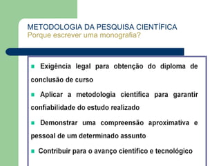 O documento fornece diretrizes para elaboração de projetos de pesquisa, monografias e dissertações, discutindo o que é pesquisa científica, os tipos de pesquisa, a elaboração do projeto de pesquisa e o delineamento, execução e apresentação da pesquisa.