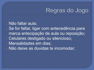 O documento fornece instruções para alunos sobre como ter sucesso no curso, incluindo não faltar aulas, manter mensalidades em dia, participar de exercícios em sala de aula e não depender apenas do professor para passar de módulo. Também fornece contatos do professor.