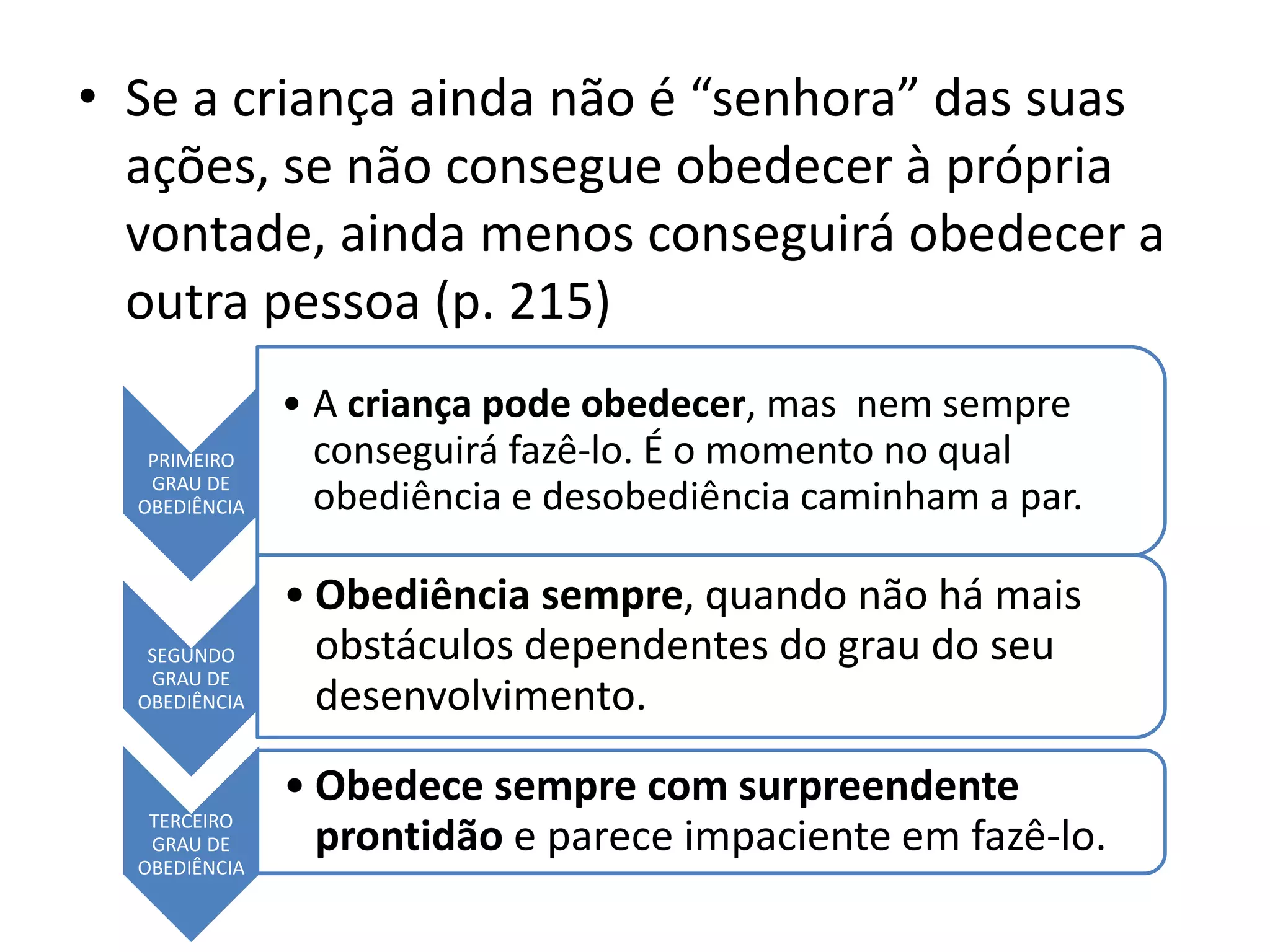 O documento descreve os diferentes graus de obediência em crianças e como desenvolver a obediência de forma positiva. Ele discute três graus de obediência que as crianças passam à medida que amadurecem, desde não conseguindo obedecer a própria vontade até obedecerem prontamente. Também descreve experiências de uma professora em ensinar silêncio às crianças através do desenvolvimento da consciência, vontade e controle próprio.